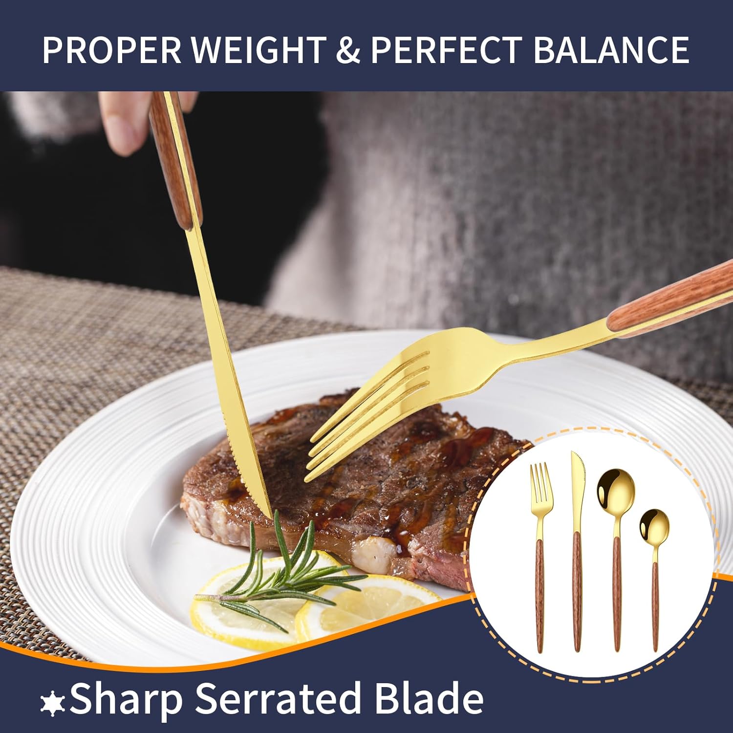 • DISTINCTIVE WOOD-GRAIN HANDLES: The eye-catching gold finish stands out from ordinary silverware, paired with uniquely textured wood-grain handles that create a vintage yet luxurious aesthetic. The smooth surfaces and slim ergonomic design not only enhance its upscale appearance but also prevent hand fatigue during use. For those seeking distinctive tableware, this set is unmissable