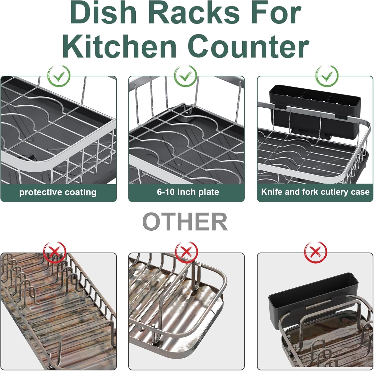 • 304 stainless steel material:Dish rack durable and more at ease All stainless steel body structure, thickened frame design,wet environment for long-term use without deformation,solid load-bearing to meet the family's daily storage needs