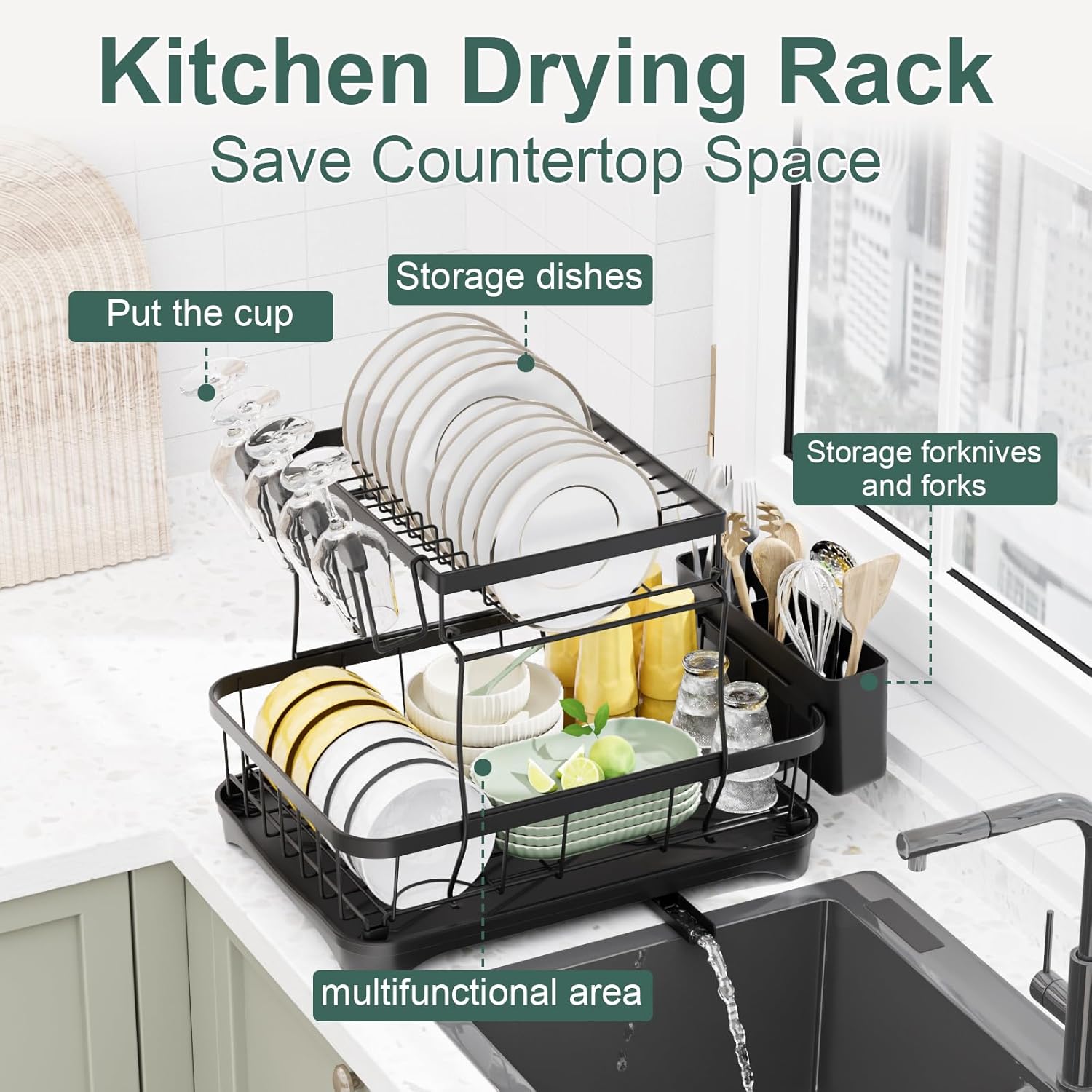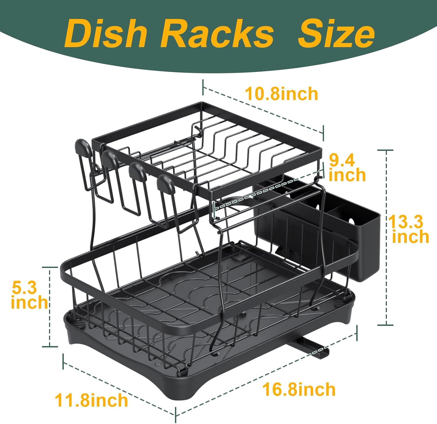 • Double-layer reinforced structure :2 Tier dish drying rack durable iron frame,thickened draining tray design, with non-slip rubber sleeve,solid not run position,no need to repeatedly adjust the position when washing dishes