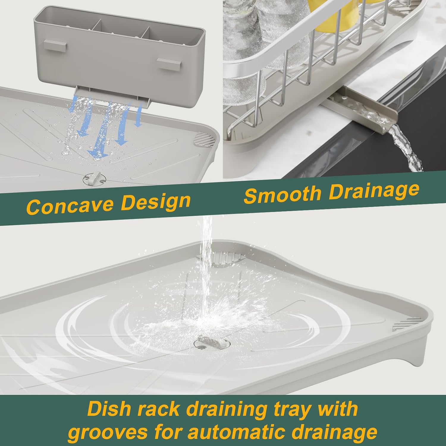 • Adjustable drainage port design upgraded leaching efficiency:Dish drying rack freely adjustable water guide groove with tilted catch tray, water quickly discharged without stagnation, to keep the countertops dry and clean