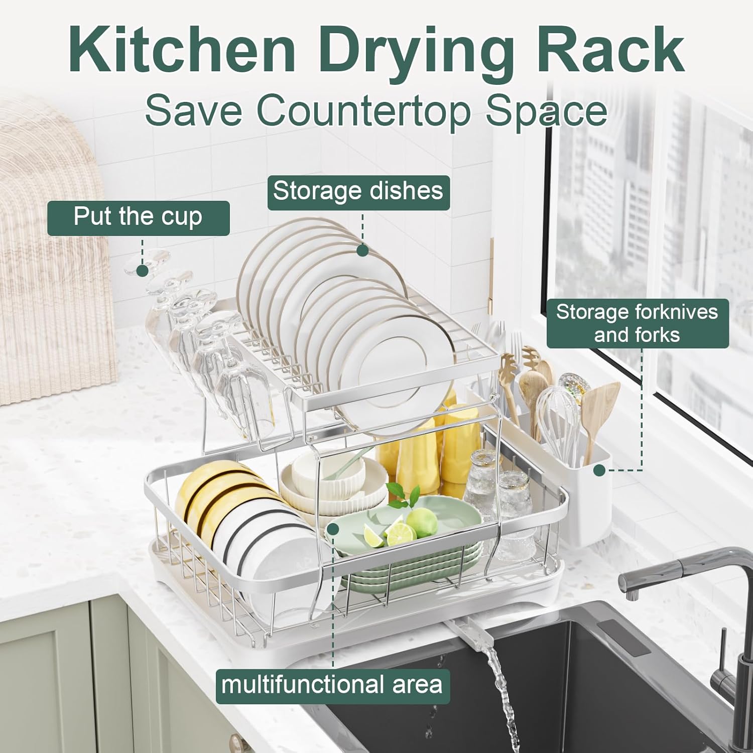 LIYI Dish Drying Rack,Large Dish Rack for Kitchen Counter,2-Tier Dish Racks with draining Tray,Detachable Capacity Dish Drainer Organizer,White