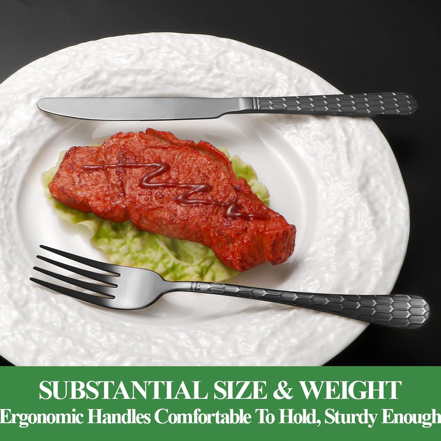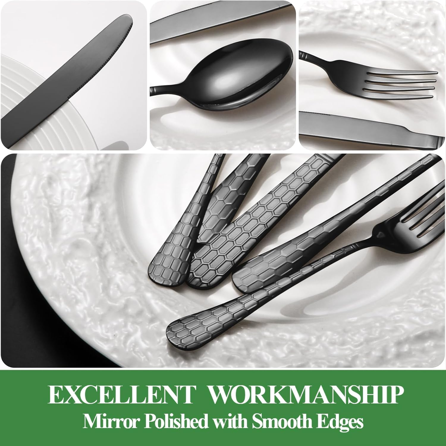 • WONDERFUL WORKMANSHIP AND FUNCTIONAL---Our black utensils set is made of multiple mirror polishing treatment, silverware set with Water Cube handle design Each piece is beautifully adorned with a delicate Water Cube pattern,edge smooth , elegant and classical appearance, adding to the beautiful experience of everyday dining.
