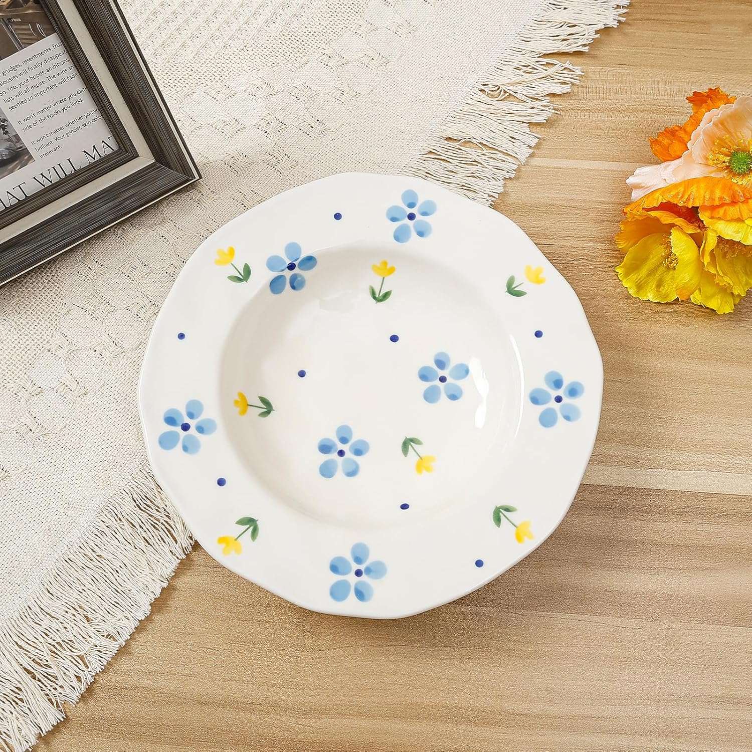Koythin Ceramic Straw Hat Ramen Bowl Set, Pasta Bowls, Salad Serving Bowl for Noodle, Dinner, Salad, Microwave Dishwasher Safe (Blue and Yellow Tulips)