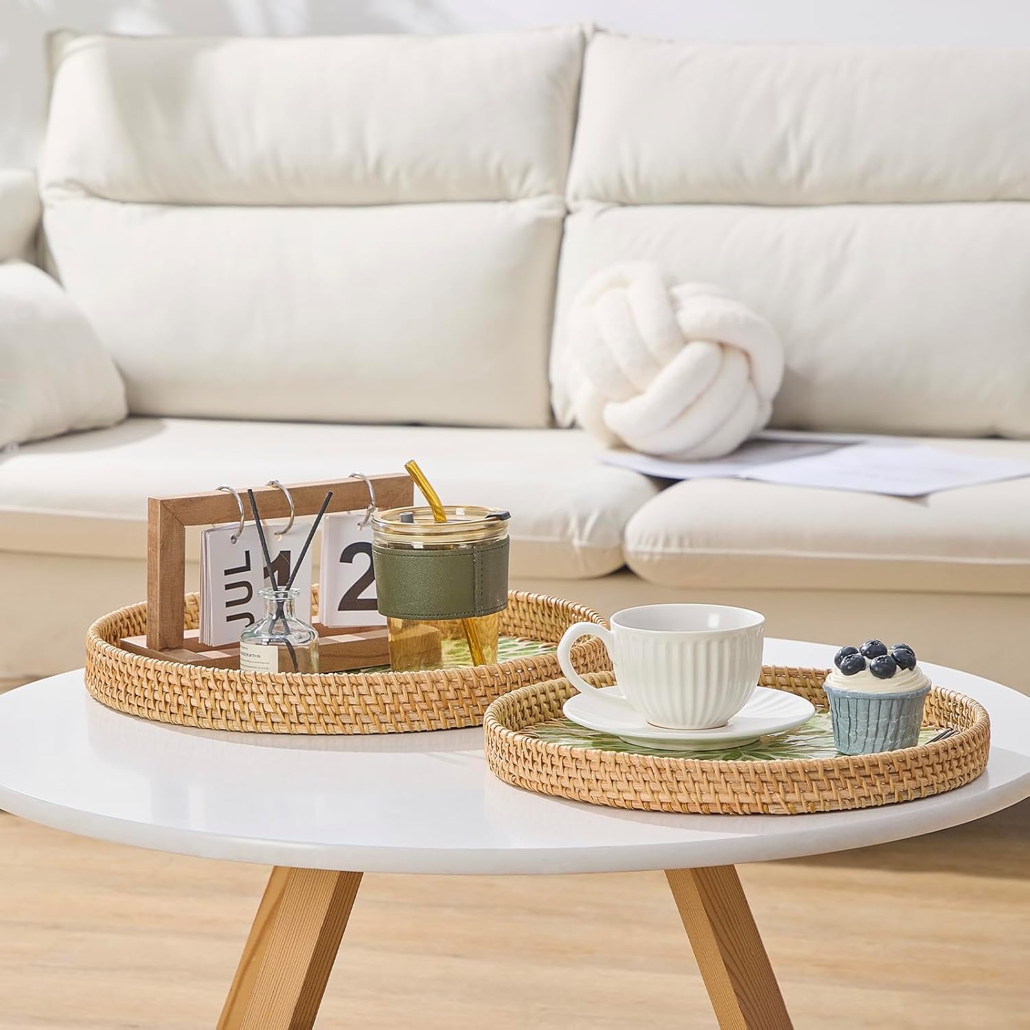 Round Rattan Tray with Mother of Pearl Inlay, Rattan Serving Tray with Wooden Base, Decorative Wicker Basket for Table Decor, Storage and Display of Coffee Bread Food Fruit (Leaf 13.5")