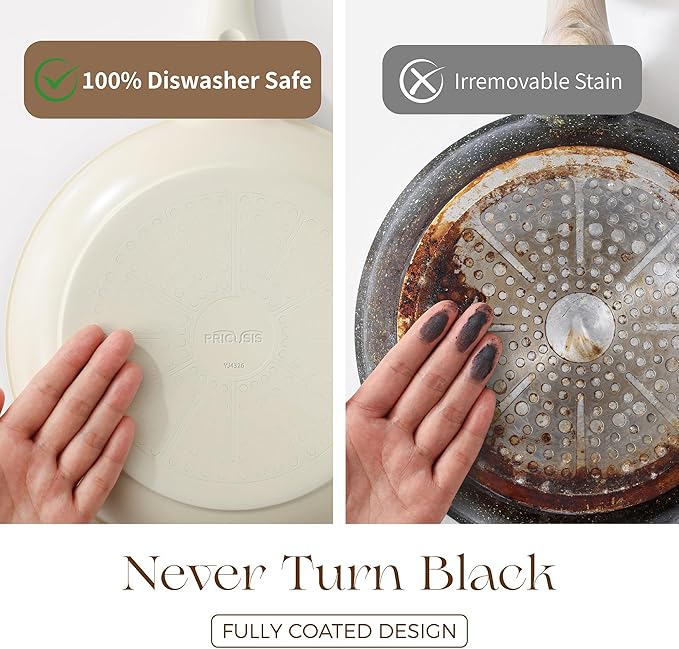 PRICUSIS Nonstick Ceramic Frying Pan with Lid, 8/10 Inch Skillet with Stay Cool Handle, Fully Coated, 100% Dishwasher Safe, Oven Safe, PTFE PFAS & PFOA Free (10 Inch, Coconut White