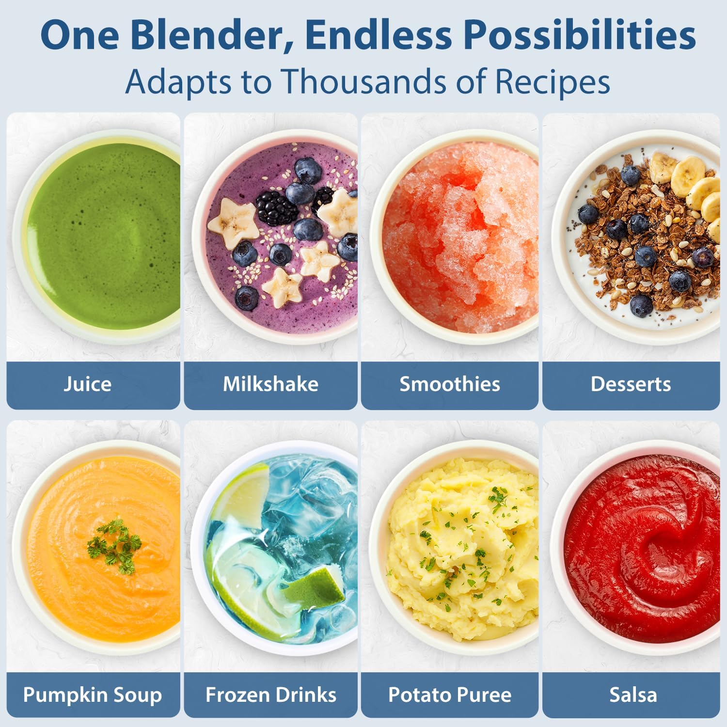 • Smart 3+7 Programs Control:The smoothie blender simplifies operation, preset smoothies, juices, crushed ice, one button directly. Seven adjustable speeds allow seamless task switching and precise texture control, empowering you to create diverse flavors. These versatile functions support endless culinary experiments, making meal preparation effortless.