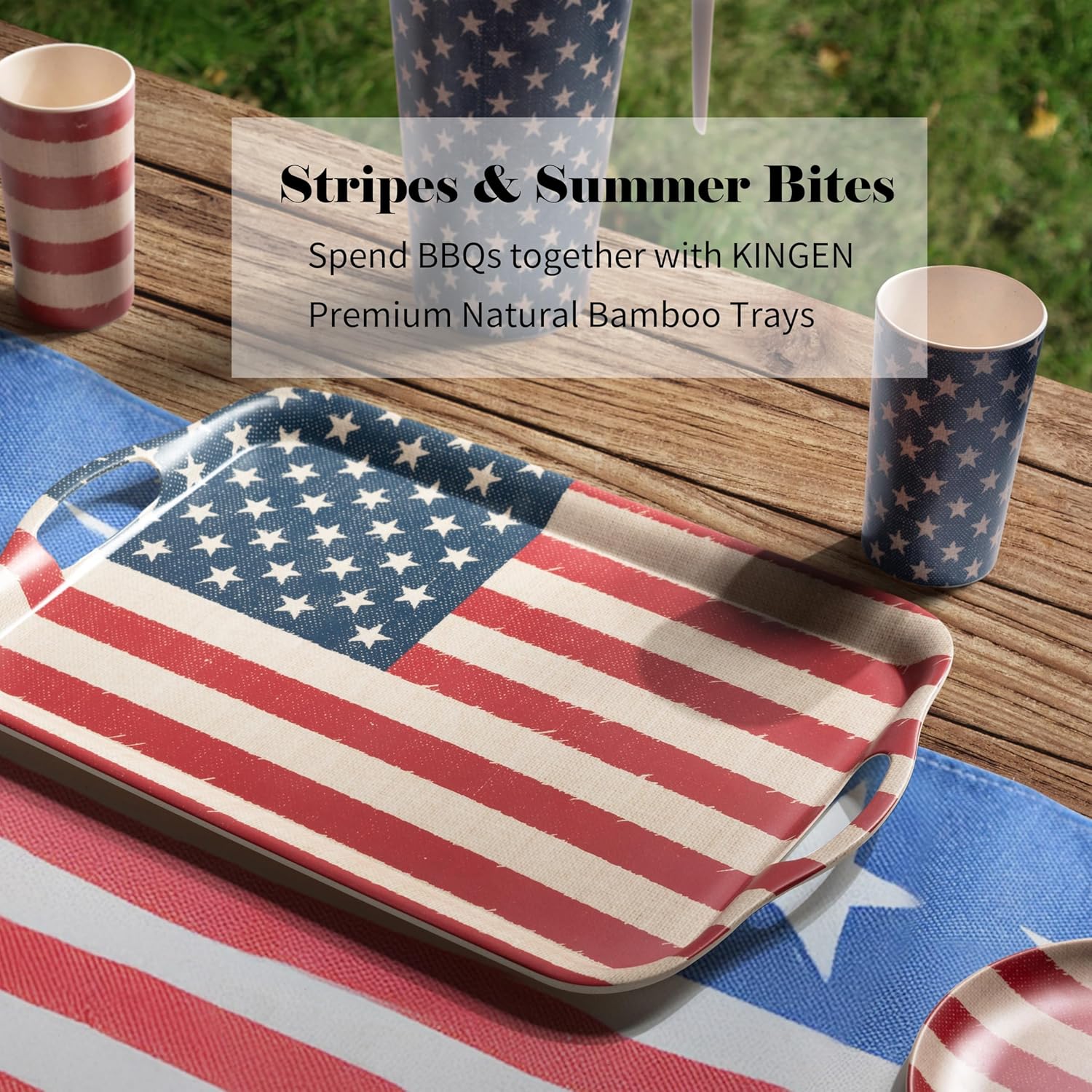 KINGEN 2-Pack Patriotic Bamboo Fiber Serving Trays - 18×13-inch Extra Large w/Handles Tray, Stars & Stripes Platters for 4th of July, Christmas, Birthday, BBQ, Party - Red, White & Blue Decor