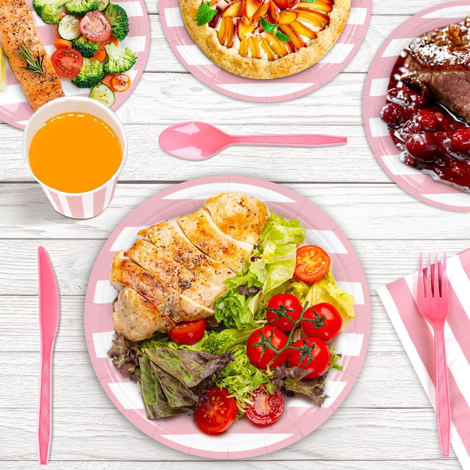 • SERVES 24 GUESTS: This Pink and White Sets has all you need for 24 guests, includes 24pcs 9” Dinner Paper Plates, 24pcs 7'' dessert Plates, 24pcs paper Napkins, 24pcs paper cups ,24pcs forks, 24pcs spoons, 24pcs knives.