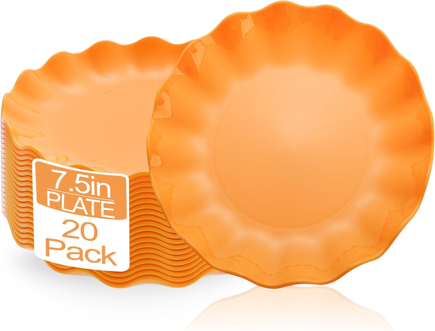 LIYH 20 Pcs 7.5 Inch Orange Plastic Plates Reusable - Unbreakable Dessert Scalloped Plates-Dishwasher Safe for Halloween & Thanksgiving Party BPA Free