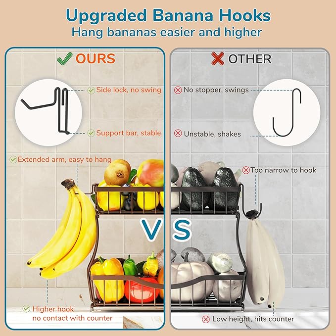 • Banana Hangers: Includes two detachable banana hooks for natural, organized hanging