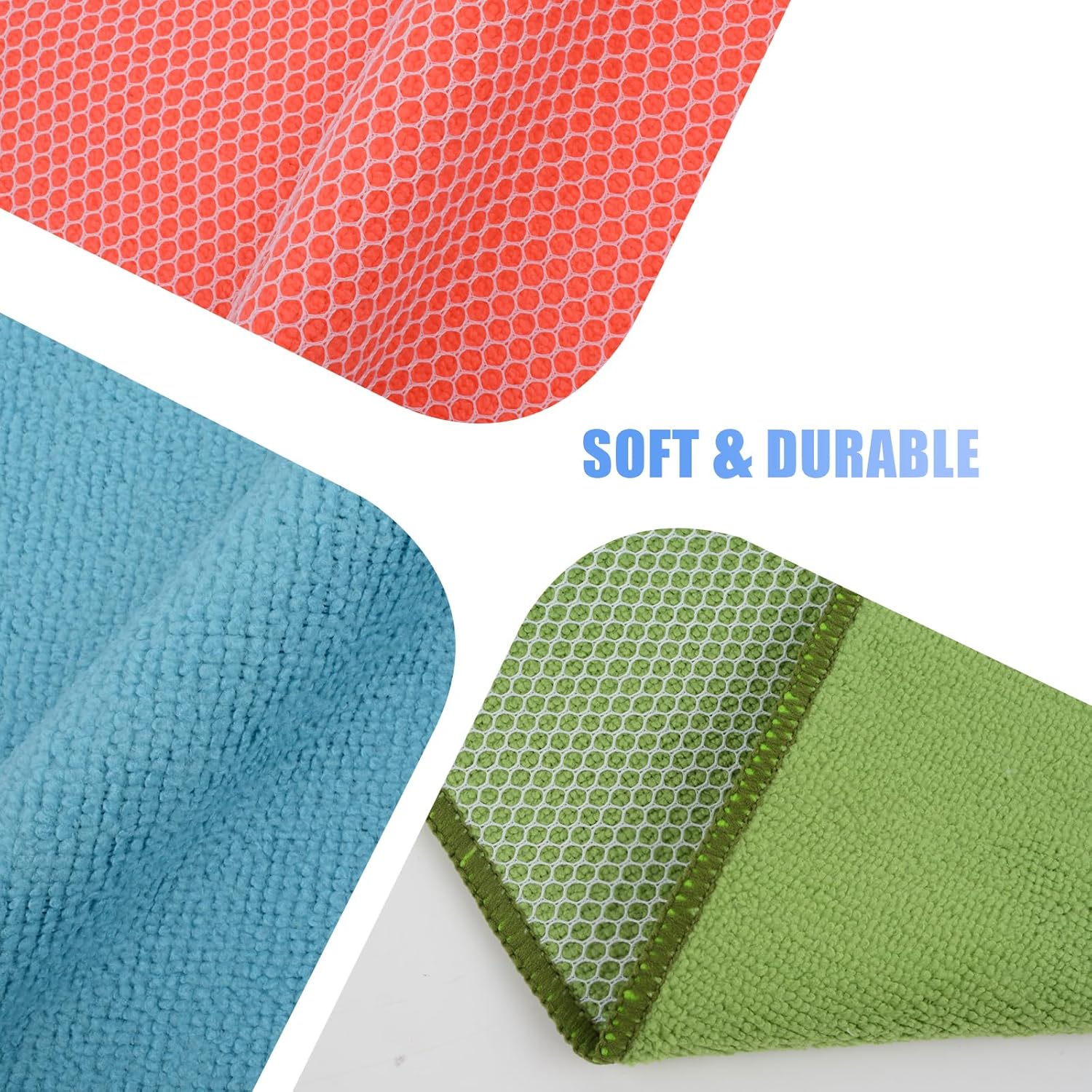 • DISH RAGS FOR KITCHEN CLEANING WITH POLY SCOUR SCRUBBING SIDE: One side is microfiber and the other side is mesh. The microfiber side works well at getting finger spots off the stainless steel appliances and the glass front of fridge or stove, microwave; the scrubby side is good for cleaning stuck on food without having to grab your scraper and does not scratch delicate surfaces either