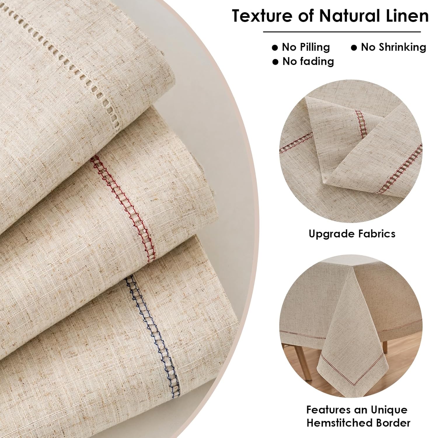 • Natural Elegance Linen Tablecloth--This tablecloth showcases the charm and texture of natural linen, with a stylish hemstitch border that adds a breezy, rustic touch to your dining table.It is made from a linen-polyester blend in a natural flax beige tone, combines natural linen's breathability with polyester's wrinkle resistance, it effortlessly complements farmhouse-style dining decor.