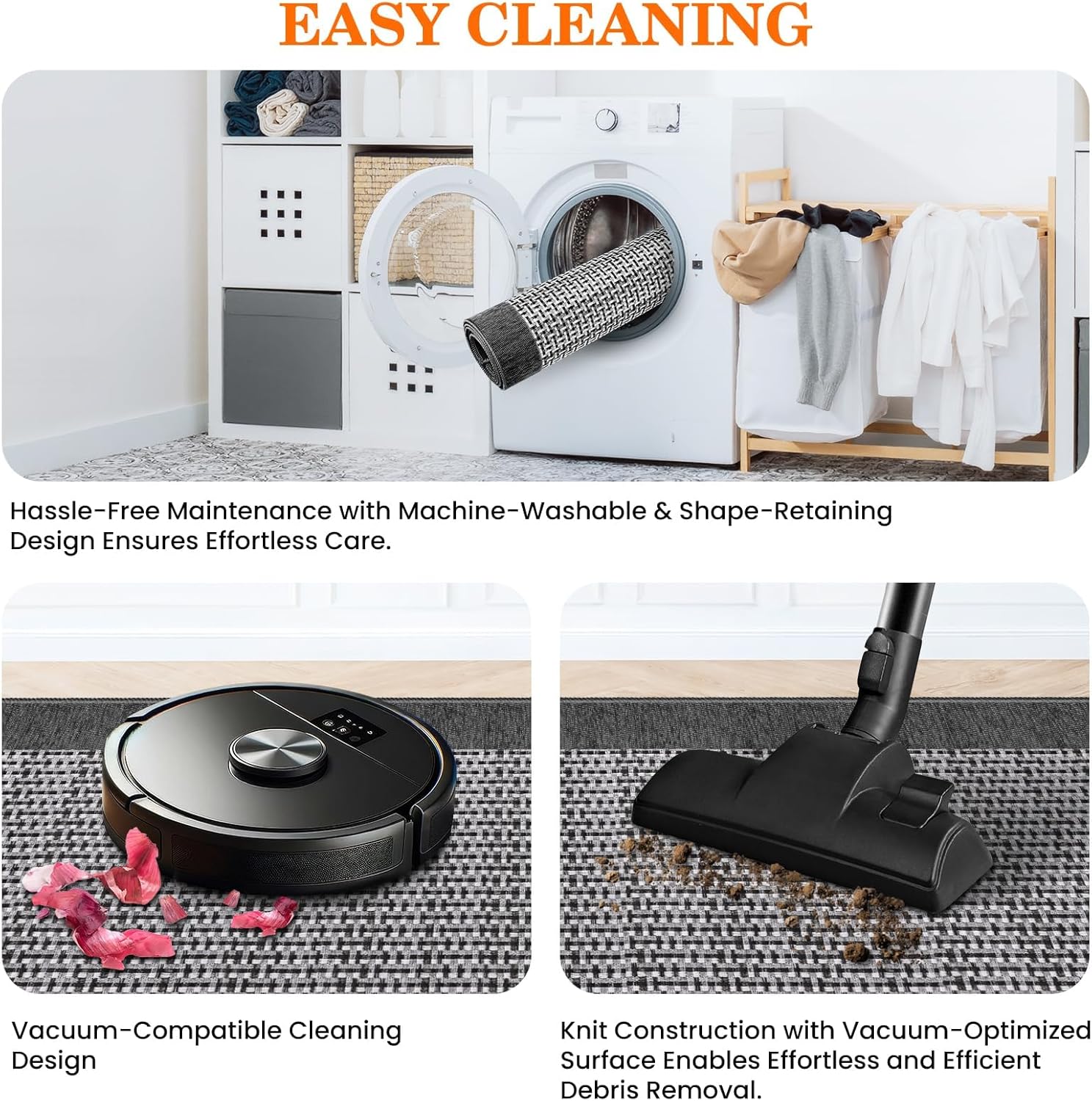 • Non-Slip Rubber Backing: These throw rugs with rubber backing feature a thickened, waterproof bottom that solidly adapted to tile, marble, and hardwood floors. Stay safe from slips while keeping moisture and grime away from your flooring