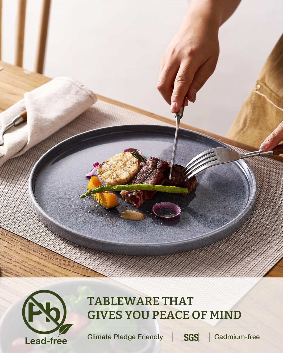 • Scratch Resistant: Our glaze is fired at 2340℉ for 13.5 hours to form a strong scratch-resistant surface. No need to worry about scratches from your forks or knives.