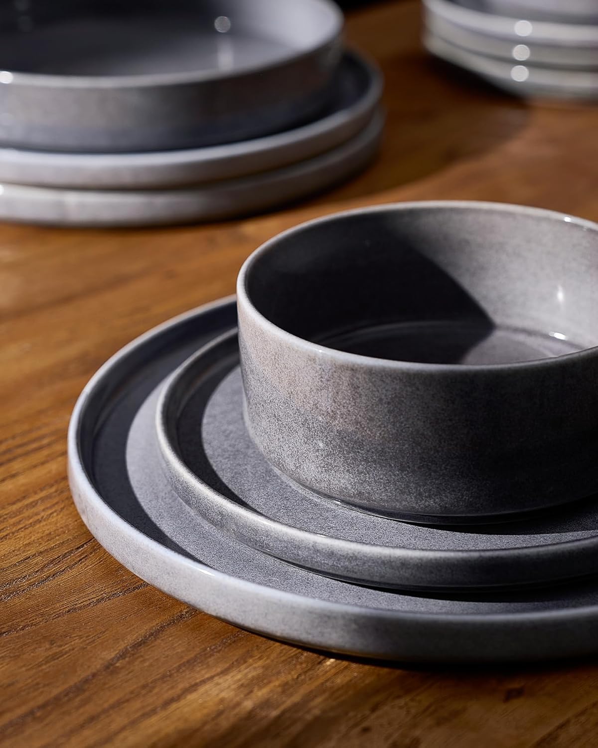 • Upgrade Your Everyday Dining With Artisan Stoneware: Stoneware dishes in dreamy gray-blue and white. Each piece features a unique reactive glaze and a hand-accented rim for a minimalist, high-end look that’s built to last.