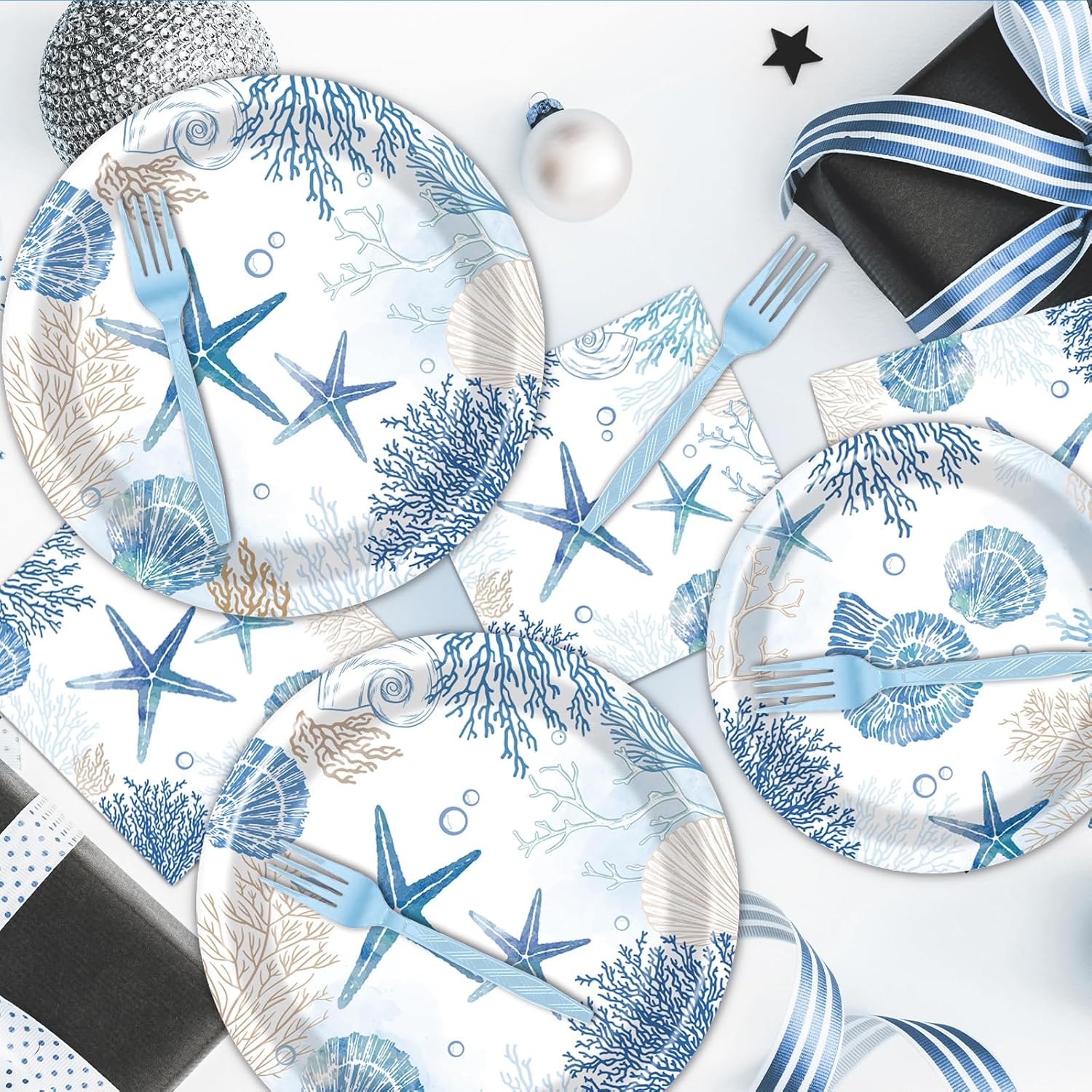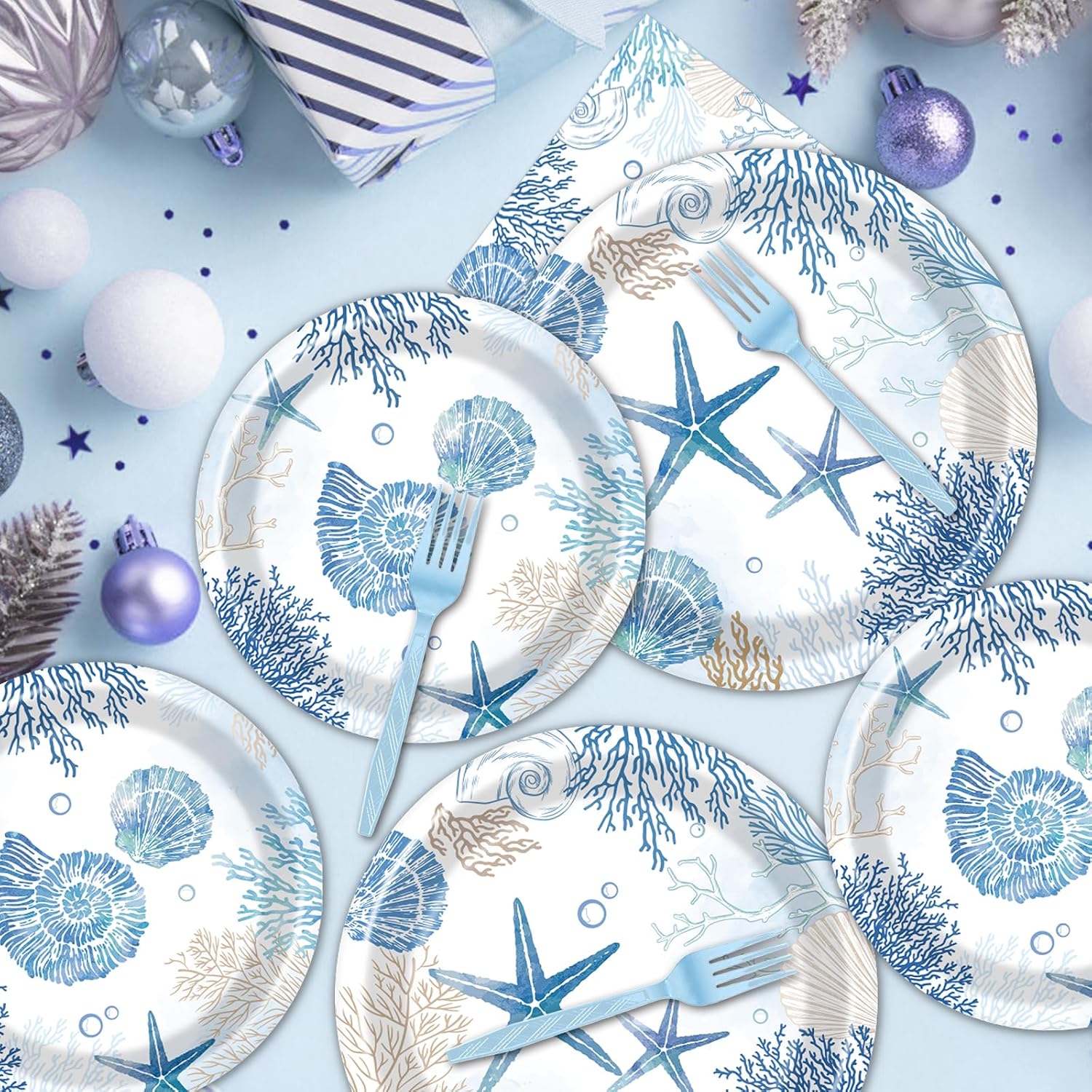 Rakuto Ocean Themed Party Decorations, 96PCS Beach Seashell Plates Napkins and Forks Set, Starfish Coral Disposable Tableware for Birthday Baby Shower Serves 24