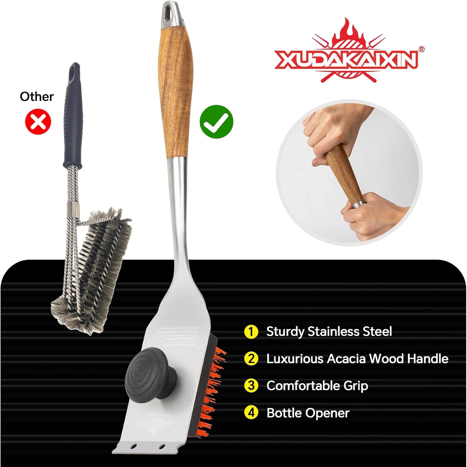 • 【 Comfortable and Sturdy Acacia Wood Handle】Designed for precision and ease, the ergonomic Acacia wood handle offers a secure, comfortable grip, making this brush as practical as it is visually appealing-an essential premium tool for any grilling enthusiast