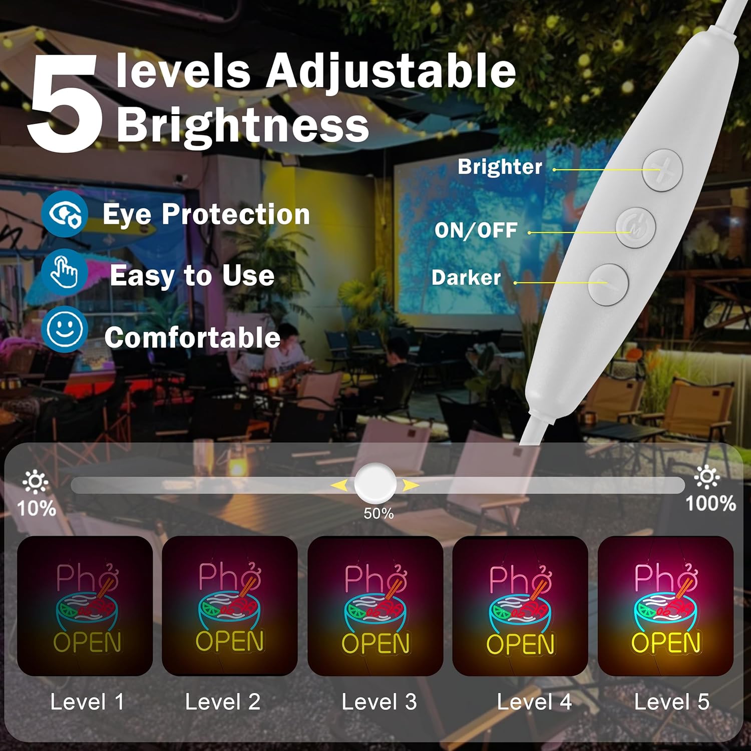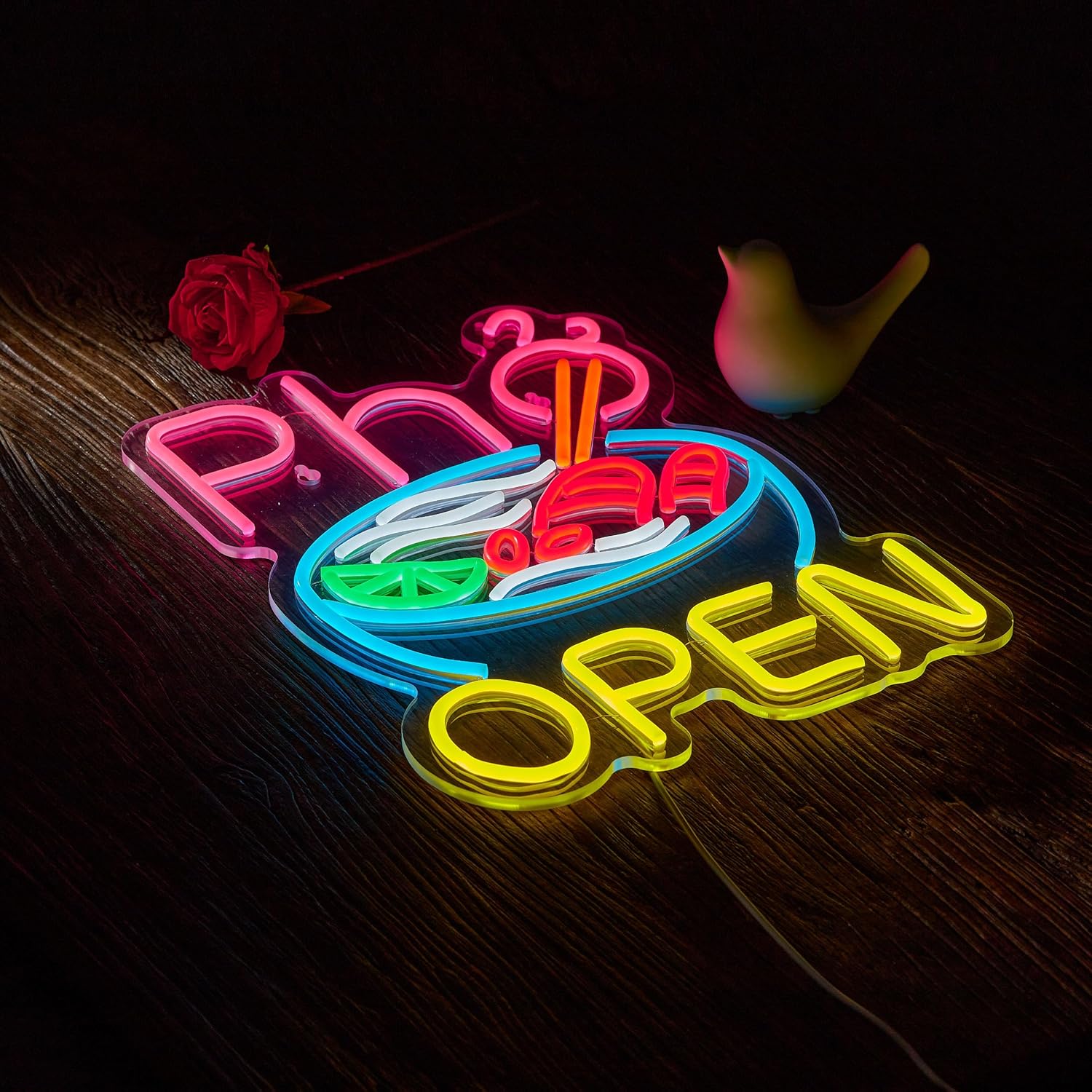 Vietnamese Pho Open Neon Sign Dimmable USB Powered LED Ramen Bowl Open Signs for Restaurant Business Food Truck Kitchen Wall Decor Light