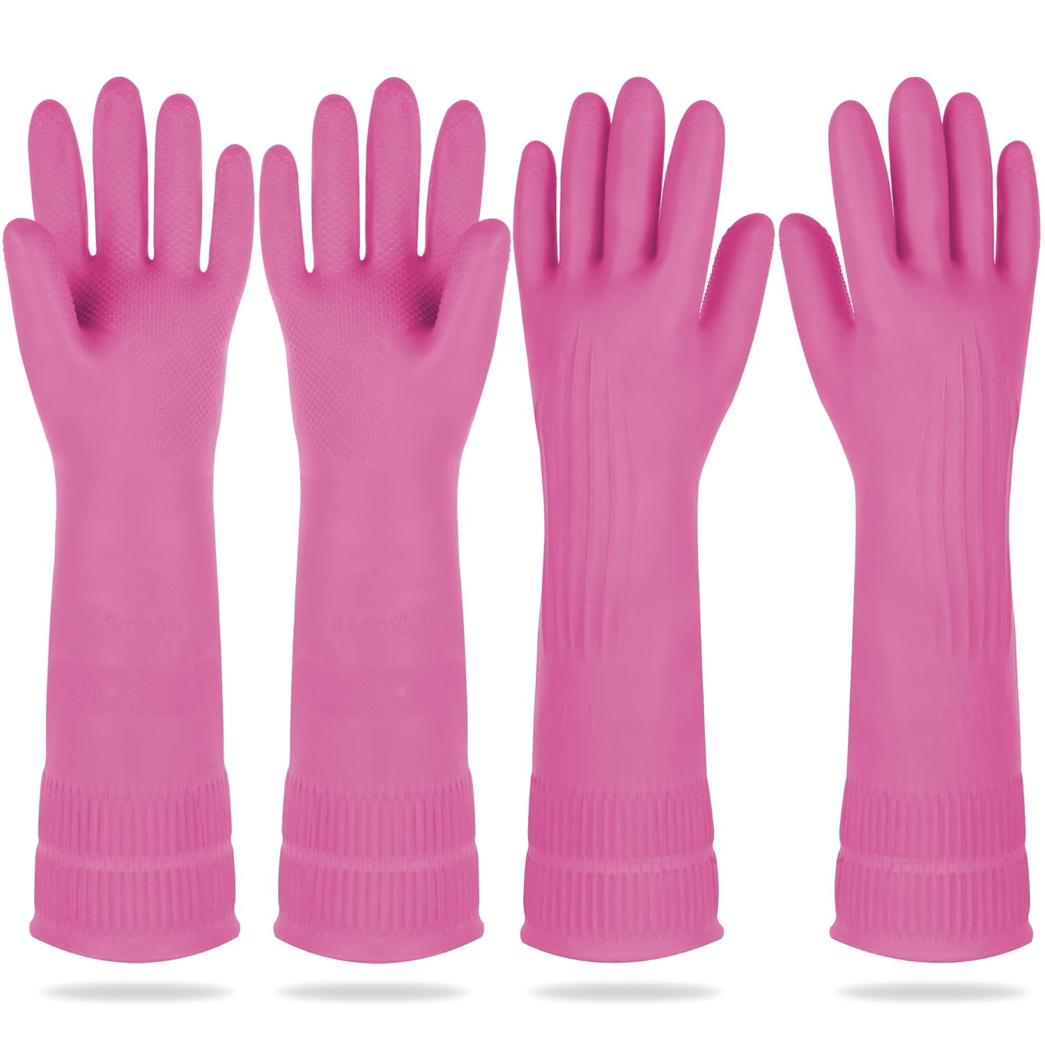Mamison 2 Pairs Reusable Waterproof Household Dishwashing Cleaning Rubber Gloves, Non-Slip Kitchen Glove (Pink, Large (Pack of 2))