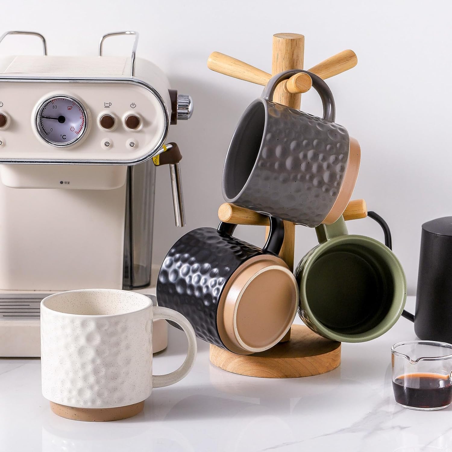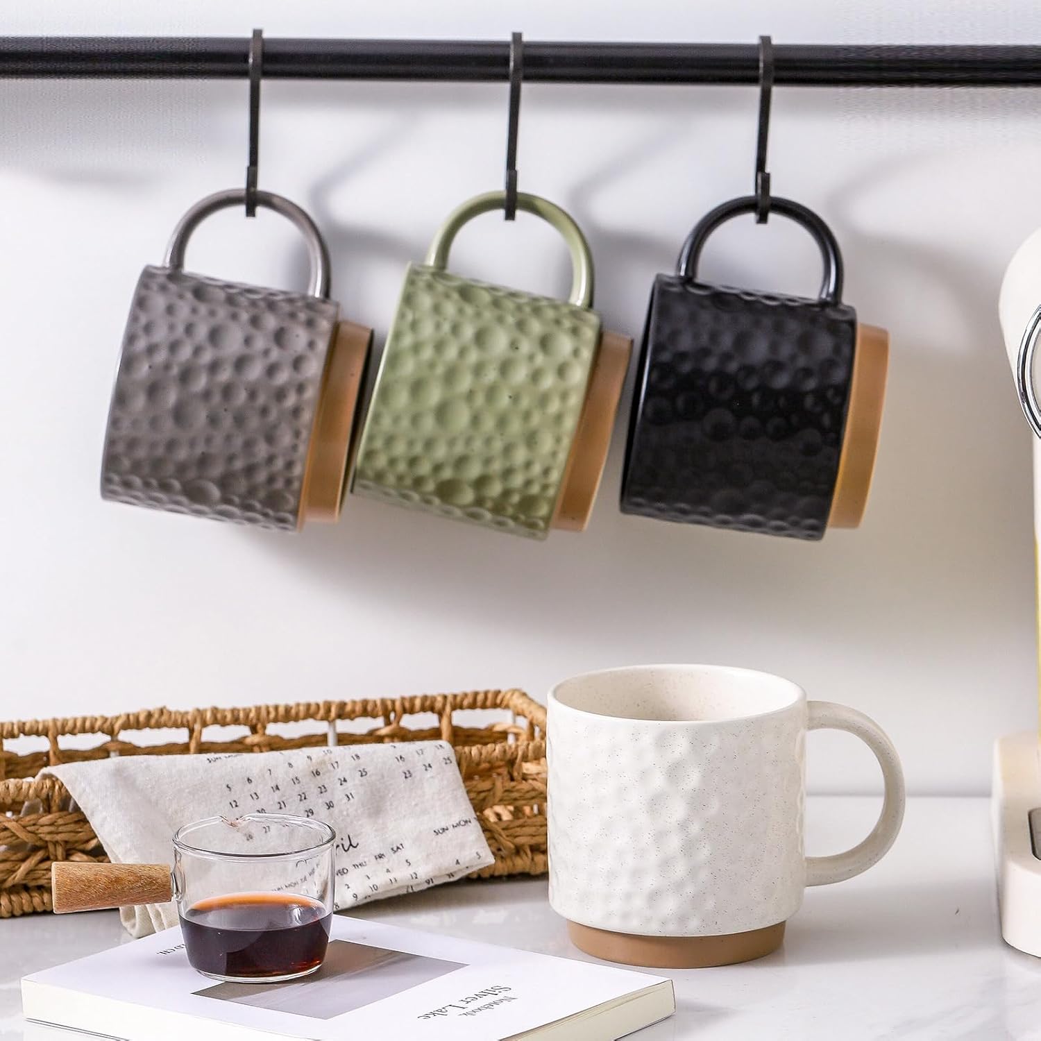 • 【DESIGN】The stackable feature allows for convenient storage and organization in your kitchen cabinet or pantry, saving space and keeping your mugs easily accessible.a beautiful embossed texture design,a large handle that fits the feel,the smooth rim ensures a comfortable drinking experience.