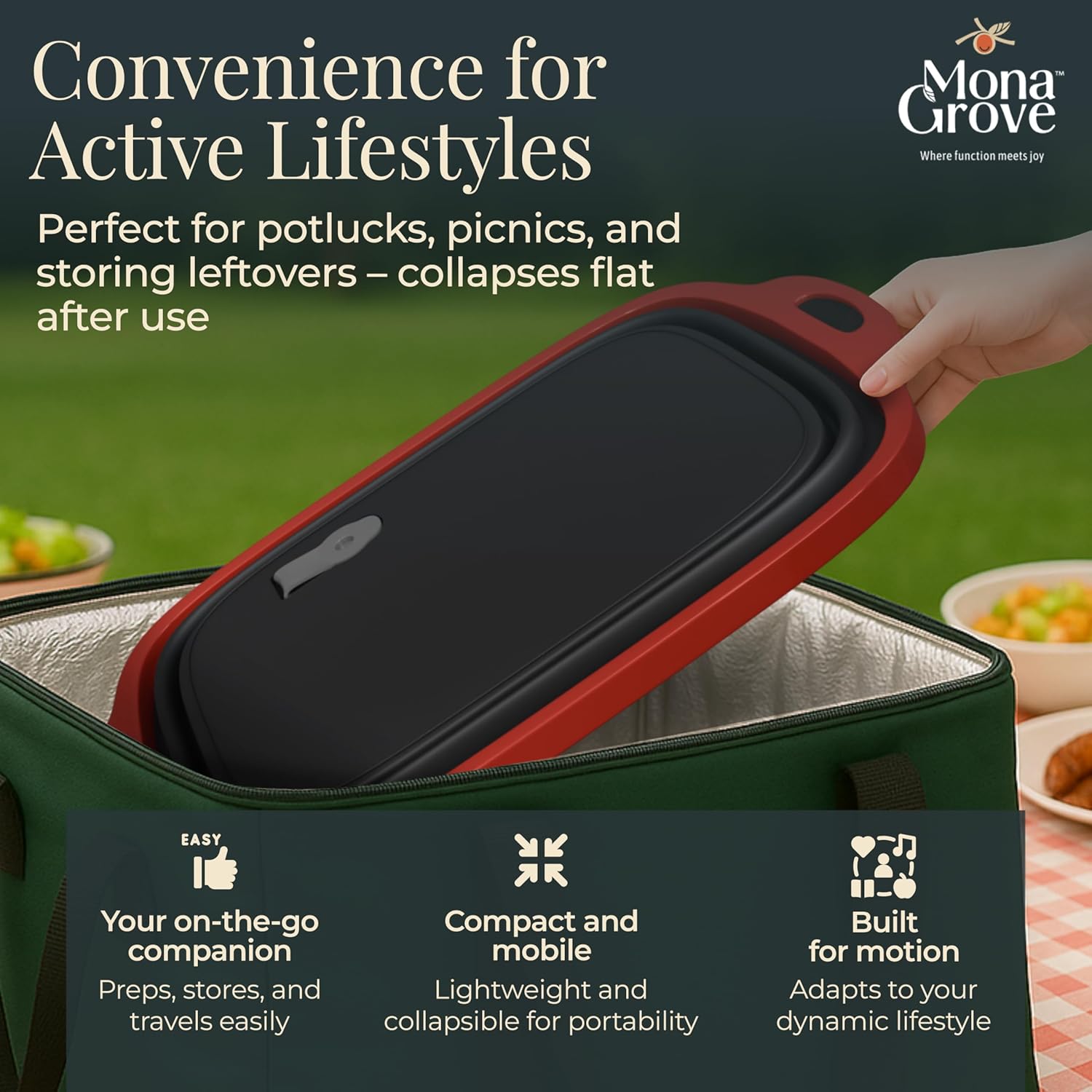 • Purposeful Design, Everyday Ease – MonaGrove's collapsible prep tub is designed for dynamic lives. Use it for marinating meats, prepping veggies, or organizing ingredients—at home or on the go.