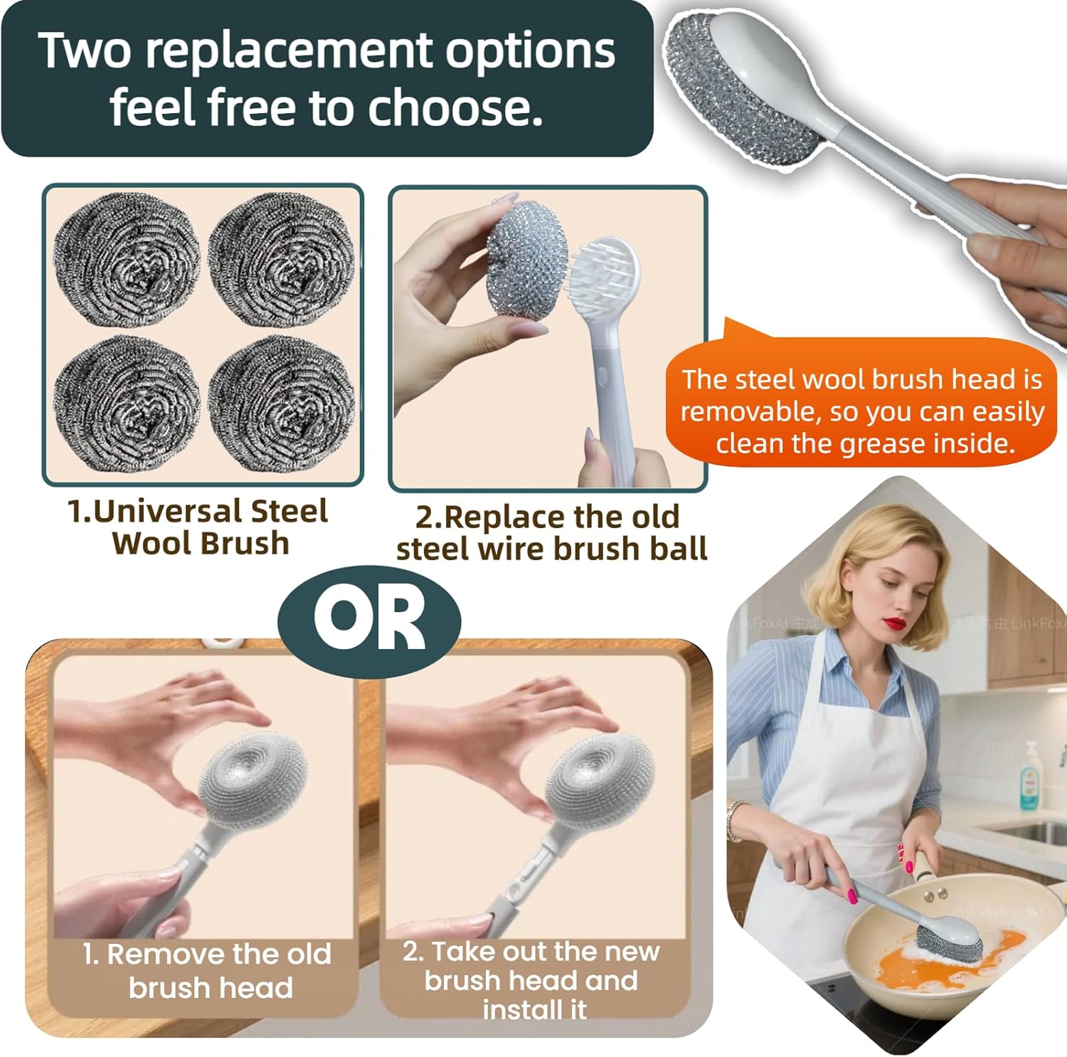 • Customizable Cleaning Power: Includes 7-inch handle ,3 specialized brush heads (steel wool scrubber brush,scrub brushes for cleaning,sponge bottle brush ) + a multi-functional storage stand. Effortlessly switch for sinks, stoves, cookware, or narrow bottles—no more struggling with single-purpose
