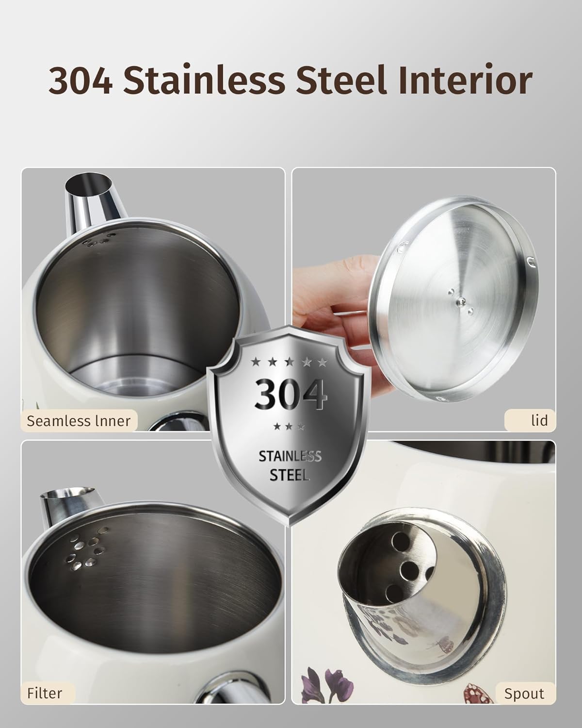 • Food-Grade 304 Stainless Steel Interior: The interior of the kettle is made of 304 stainless steel, a premium material that ensures safety and longevity