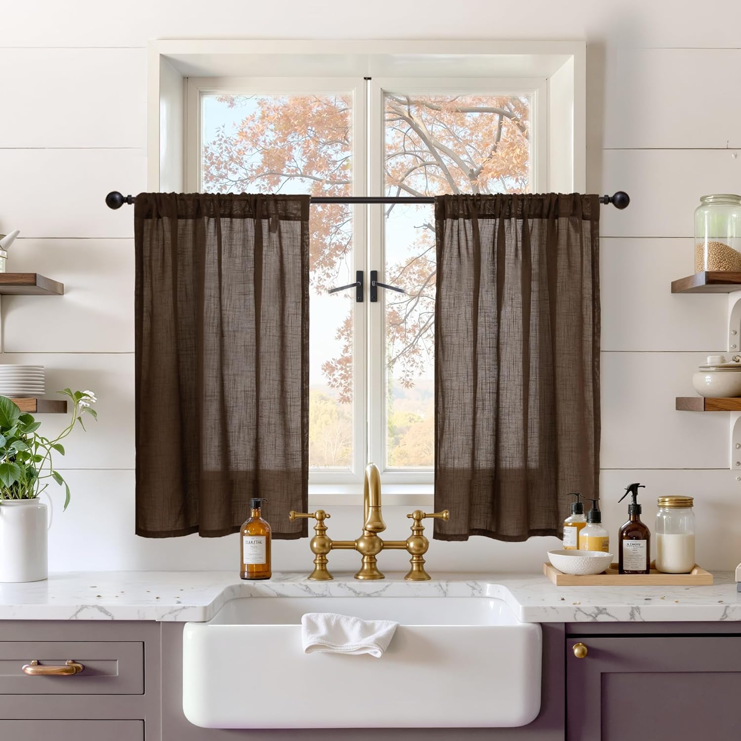 BGment Brown Linen Short Curtains 36 Inch Length for Window, Small Sheer Drapes for Kitchen Cafe Over Sink Bathroom Decor Lightweight Rustic Country Textured Rod Pocket, 2 Panels, Each 30 Inch Wide