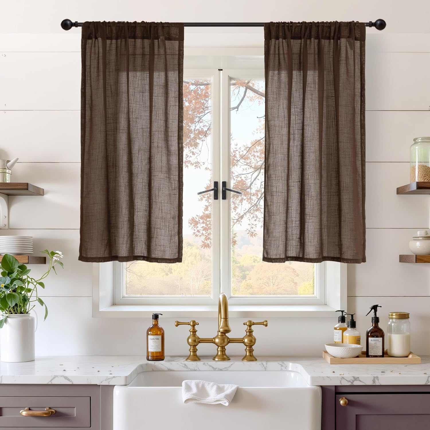 BGment Linen Short Curtains 40 Inch Length for Window, Brown Small Semi Sheer Drapes for Kitchen Cafe Over Sink Bathroom Decor Lightweight Country Textured Rod Pocket, 2 Panels Set, Each 30 Inch Wide