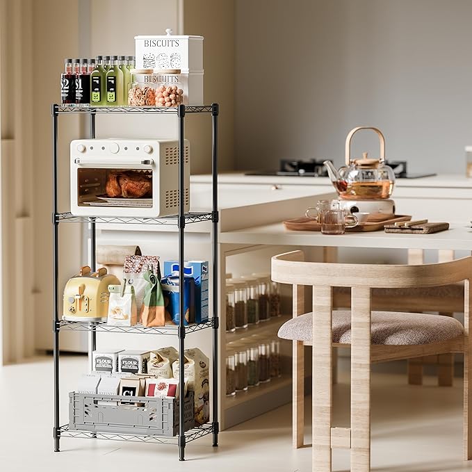 • Strong & Durable: Built with high-quality carbon steel, this 4-tier wire shelving unit offers reliable strength and long-term durability. Perfect for organizing kitchen supplies, office essentials, or household tools.