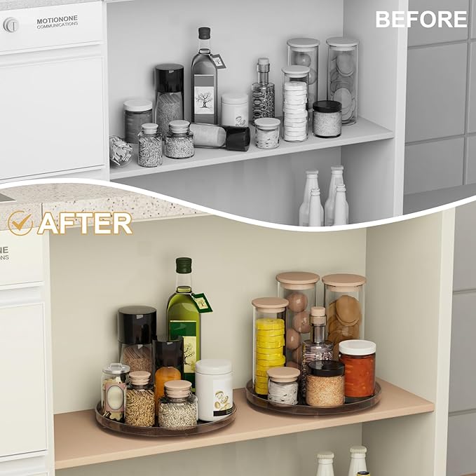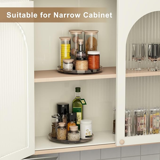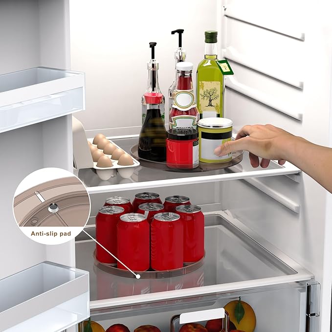 • Anti-slip & Moisture-proof: The silicone pads keep the spinning tray firmly in place while drainage holes prevent water buildup, making them ideal for humid areas like refrigerators, undersinks and bathrooms