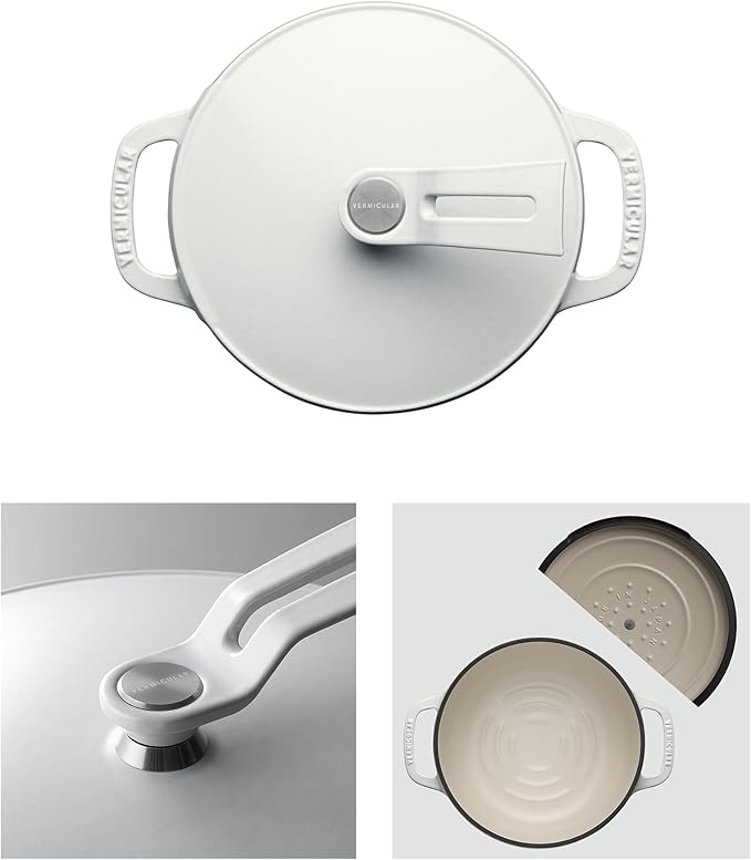 • Instant Evaporation: With Vermicular’s proprietary enamel coating, the pot quickly eliminates surface moisture, making the pot ideal for fast cooking methods like searing, stir-frying, and steam-roasting.