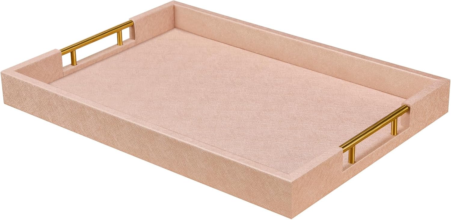 14x20 Inches Champagne Faux Leather Wrapped Wood Serving Tray with Metal Handles for Various Occasions, Ottoman, Home Decorative, Living Room, Coffee Table Organizer, Serving Breakfast On Bed