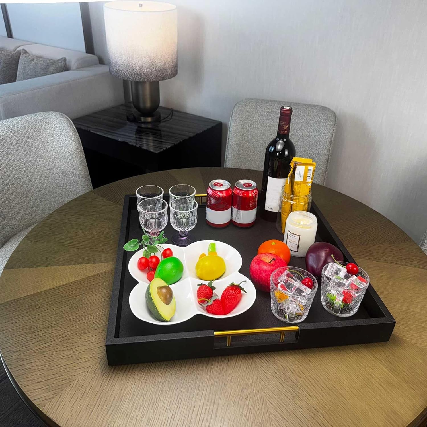 • Classic design and sturdy structure :This wood ottoman tray is made of sturdy MDF and all sides are wrapped by Faux leather(bottom included). This wooden decorative serving tray has a texture and feel like real leather and gives a high-end and stylish looking