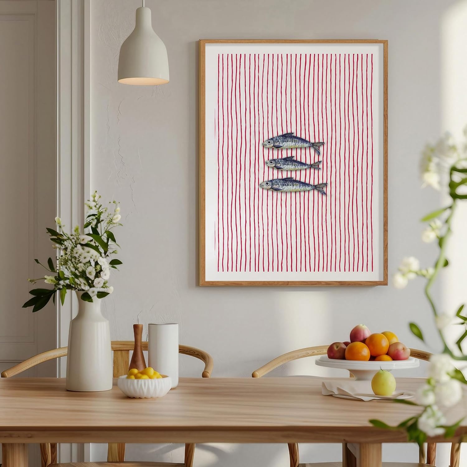 Kitchen Wall Art Farmhouse Kitchen Poster Fish Art Poster Striped Sardines Print Vibrant Red Stripes Ideal for Coastal Home Dining Room Cafe Coastal Nautical Modern Wall Decor 12x16 Inch UnFramed