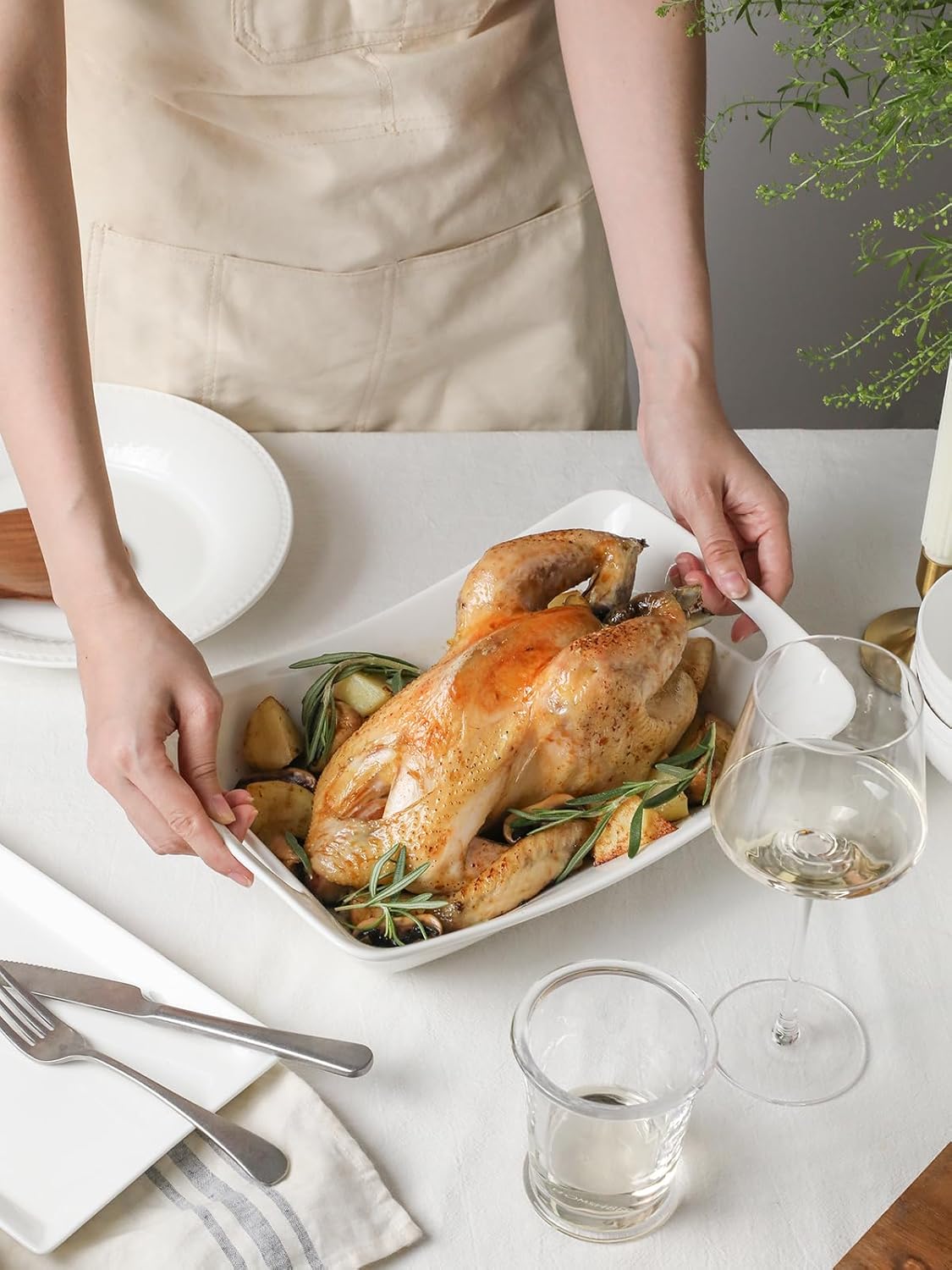 • No-Spill Design & Space-Saving - Designed with the perfect depth to securely hold juicy roasts, saucy pastas, and gravy-laden dishes without mess. This set includes two serving platters, they can stack neatly for compact storage, saving valuable cupboard space.