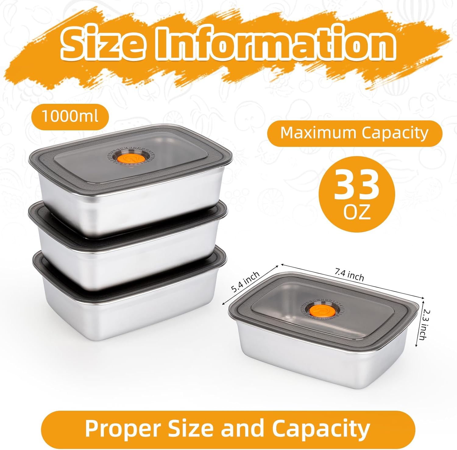 4 PCS Stainless Steel Food Storage Containers(33oz) with Lids Leak Proof & Airtight | Stainless steel freezer Containers,Airtight Bento Lunch Box,For Meal Prep,Fruit,Snack,Freezer