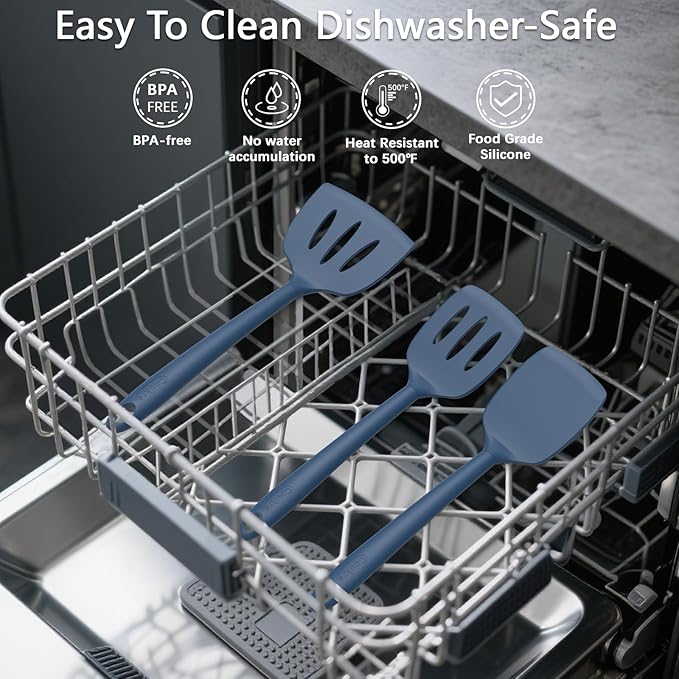 • [Easy to Clean & Dishwasher Safe]: The non-stick silicone surface makes cleanup a breeze, and all utensils are dishwasher-safe for added convenience. With top hanging holes and the included storage holder, organizing and storing your utensils is easier than ever