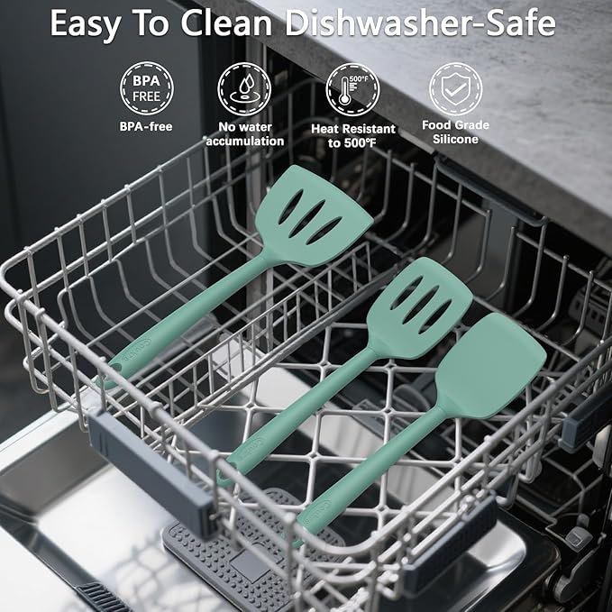 • [Easy to Clean & Dishwasher Safe]: The non-stick silicone surface makes cleanup a breeze, and all utensils are dishwasher-safe for added convenience. With top hanging holes and the included storage holder, organizing and storing your utensils is easier than ever