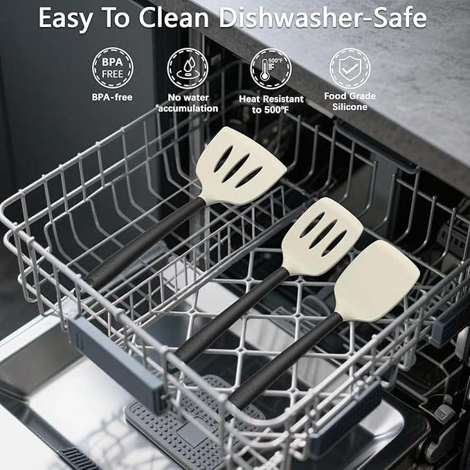 • [Easy to Clean & Dishwasher Safe]: The non-stick silicone surface makes cleanup a breeze, and all utensils are dishwasher-safe for added convenience. With top hanging holes and the included storage holder, organizing and storing your utensils is easier than ever