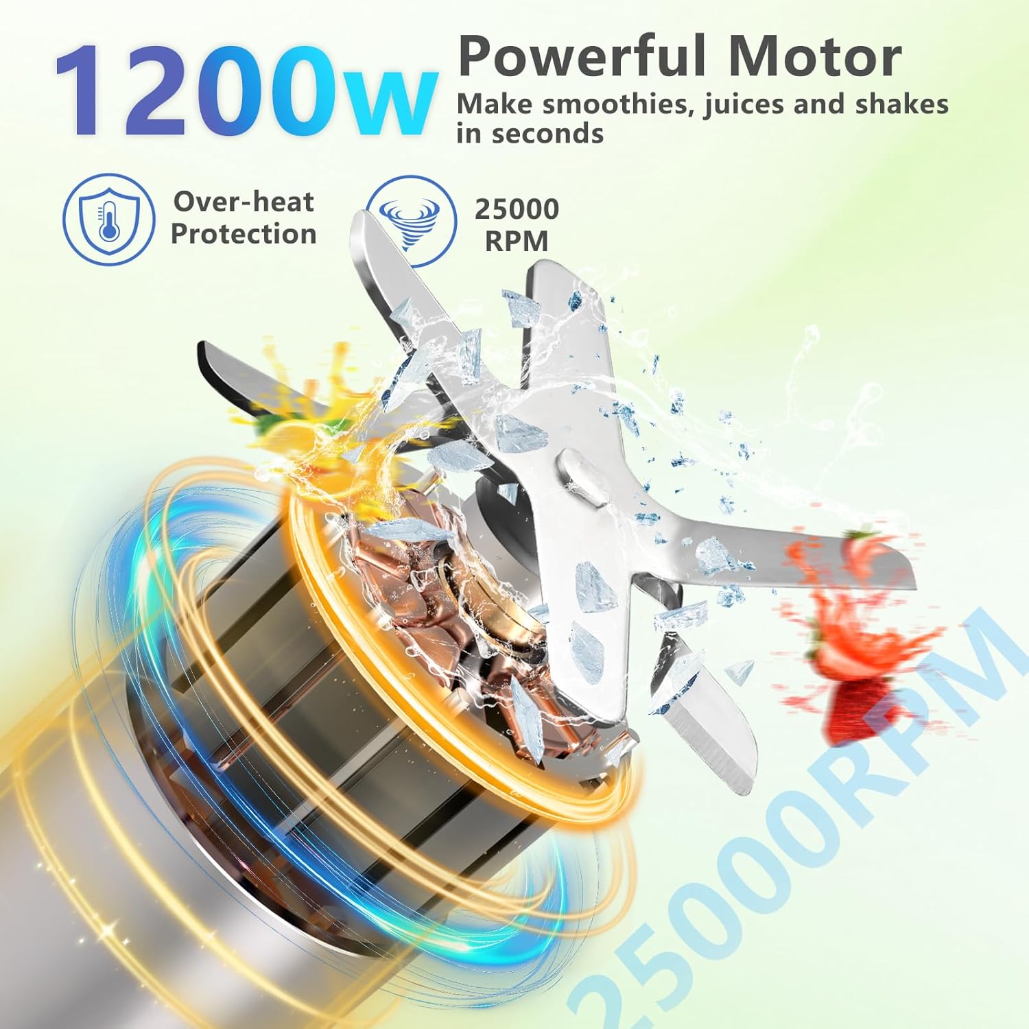 • Powerful Smoothie Blender: Our countertop blender features a 1200W motor that delivers powerful blends every time, whether you're crushing ice or blending a protein shake. The unique pulse technology achieves speeds up to 25,000 RPM, letting you enjoy perfect drinks in just 10-20 seconds. No buttons needed! Simply add your ingredients, press down, twist, and blending begins.