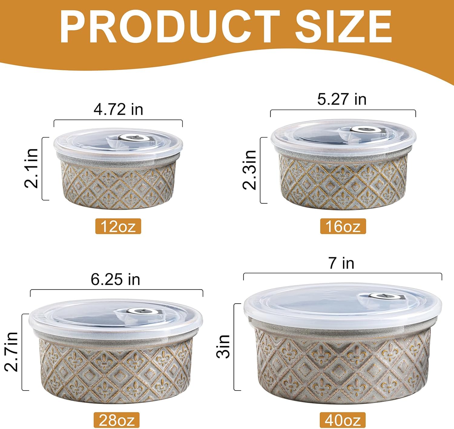 Ceramic Mixing Bowls with Lids Set of 4, Embossed Nesting Storage Bowls for Cooking, Serving, Salad, Popcorn etc, Microwave and Dishwasher Safe, Baking Dishes 12/16/28/40 oz (Gray)