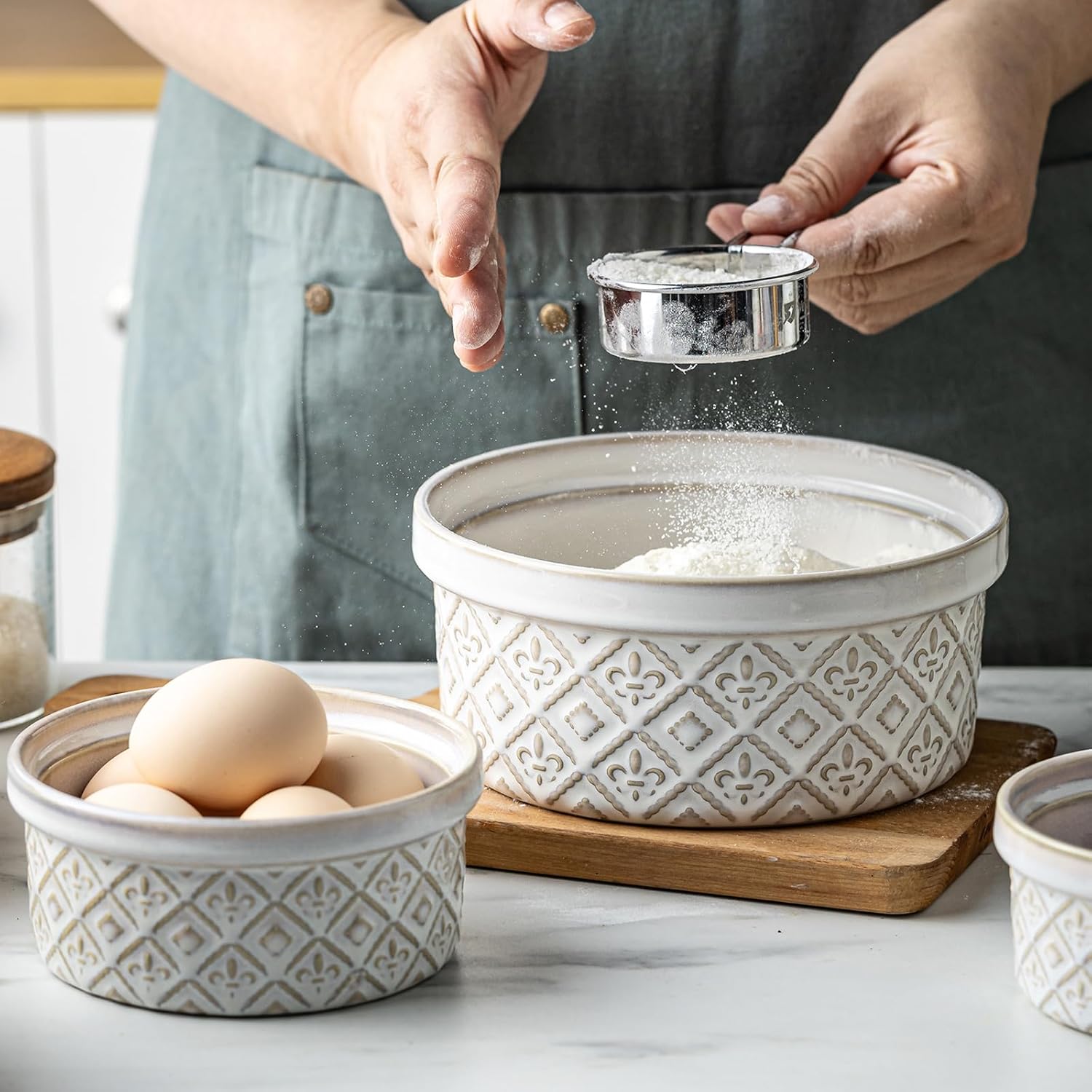 • Stable & Ergonomic Storage Bowls with Lids: Each storage bowl features a wide, stable base that effectively prevents tipping and spilling while you mix, whisk, or stir. Its ergonomic rim ensures a comfortable grip, making it easy to handle even with wet hands. The embossed surface not only adds an aesthetic touch but also provides a slip-resistant texture, enhancing stability during use
