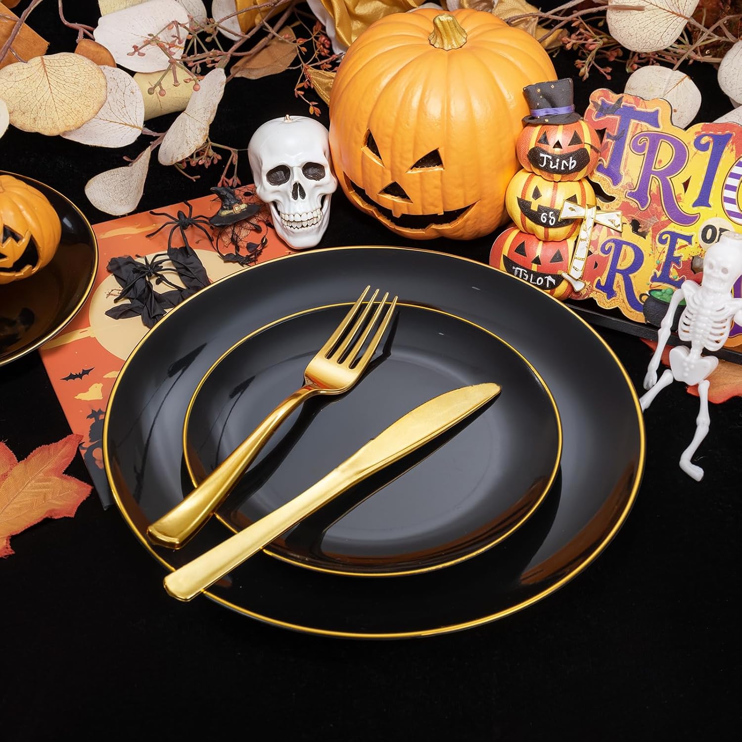 • PERFECT FOR ANY OCCASION: Whether it's wedding, birthday party, Halloween, new year, business activity, back to school, or any other special occasion, our black diposable plates with gold rim can add a touch of elegance to any event. Our black and gold dinnerware set will complete your party!
