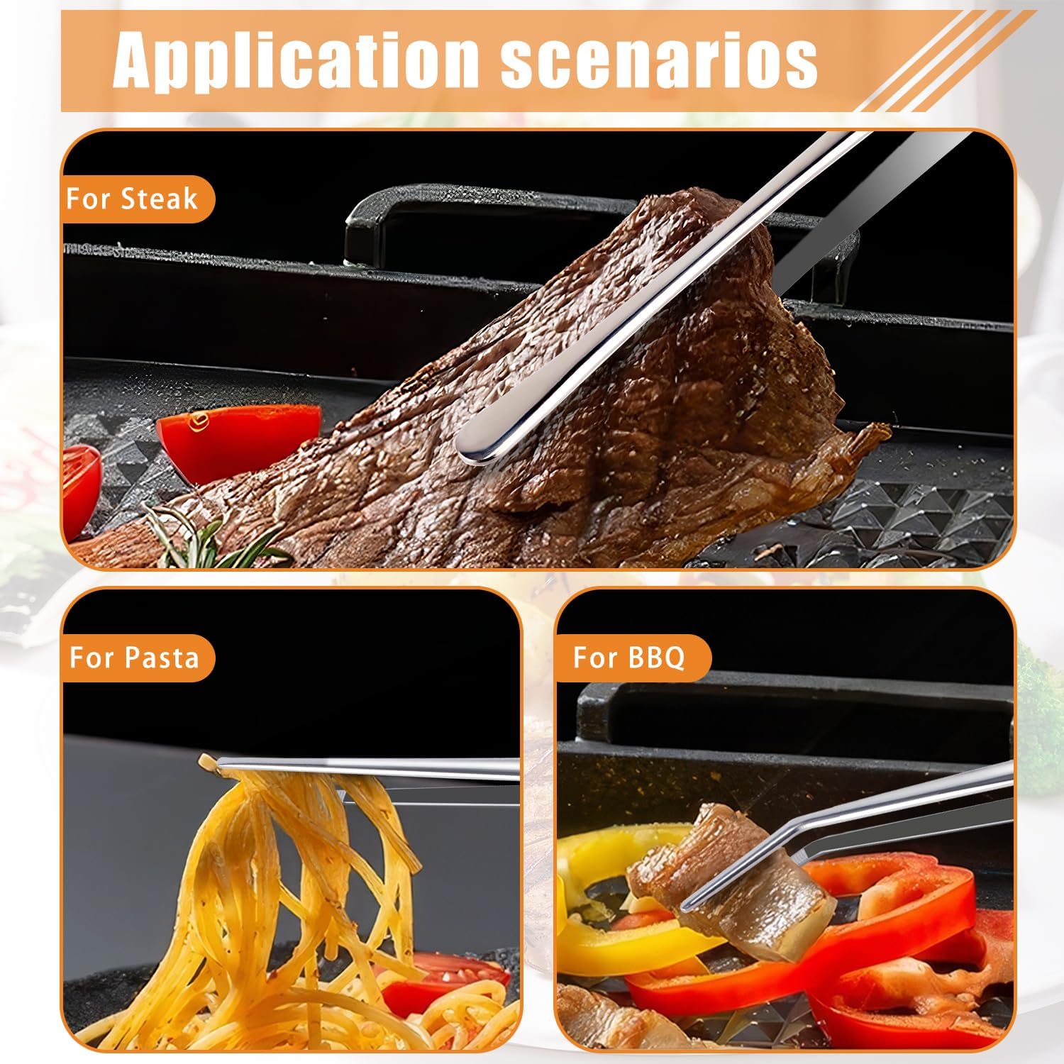 • HUMANIZED DESIGN - Each product tweezers head and hand grip part have non-slip function, and each cooking tweezers tail is equipped with a hanging ring, after use can be conveniently stored, does not take up space.