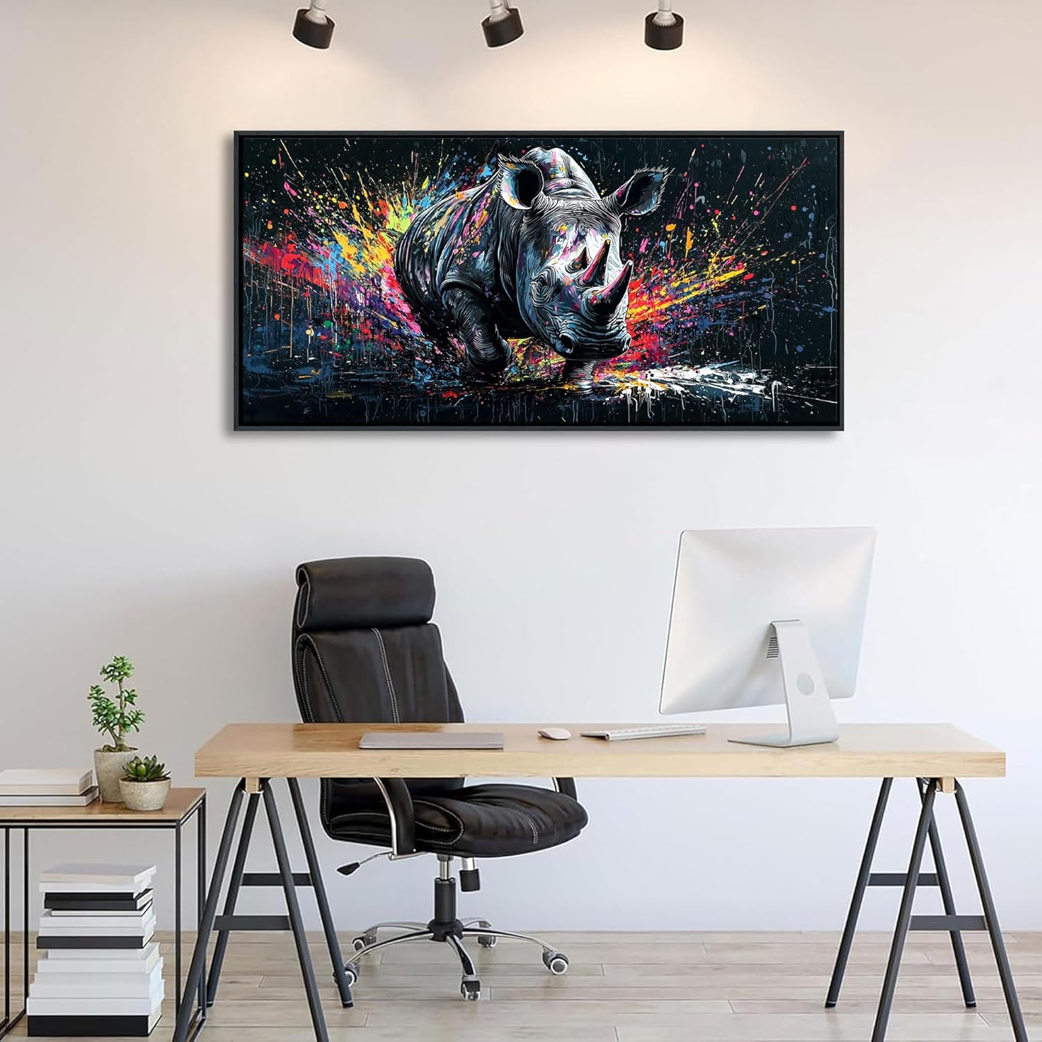 • Dramatic Visual Impact: This oil painting features a charging rhino with a burst of colorful splashes. The bold contrast between the dark rhino and vibrant colors creates an eye - catching, dynamic piece that demands attention and adds a bold statement to any space.