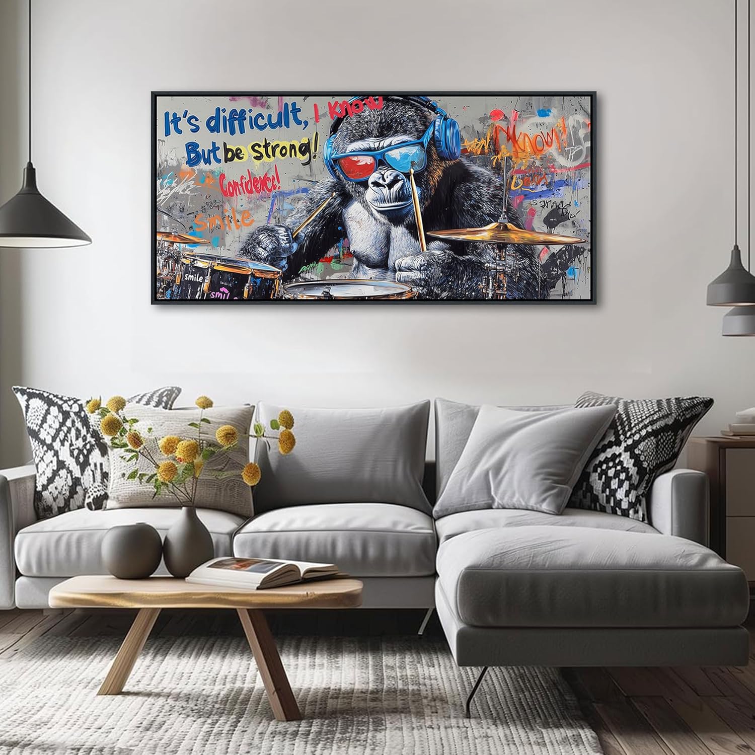 • Black Art Wall Decor: This inspirational wall art combines a cool gorilla playing drums with uplifting words like "Be Strong" and "Smile". It serves as a daily motivational reminder, perfect for anyone needing a boost of confidence and positivity in their space.