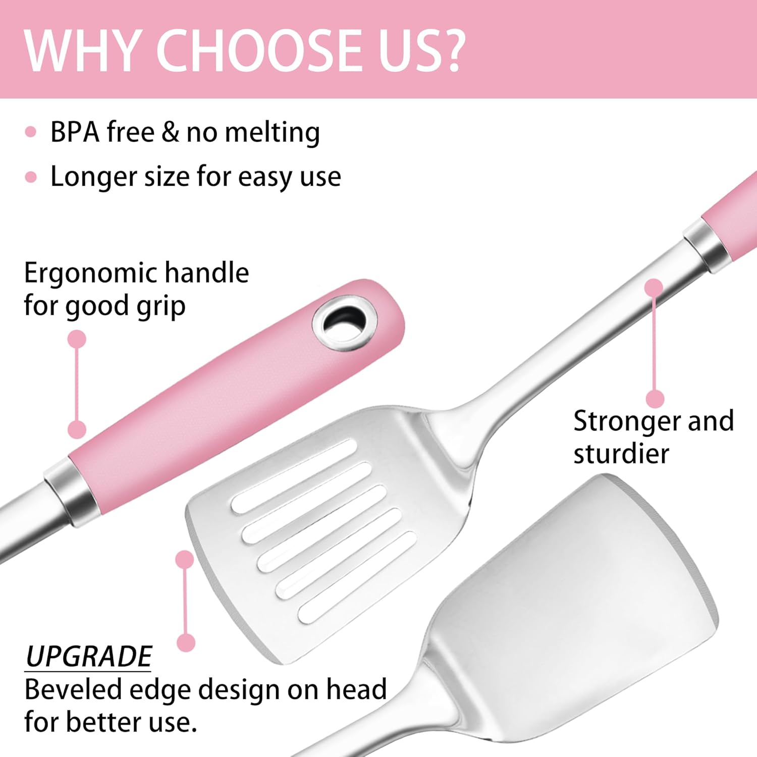 14.3-in Pink Spatula Set, 18/0 Stianless Steel Heavy Duty Turner & Slotted Spatula, Kitchen Cooking Utensils Set, High Heat Resistant, Grilling Frying Serving Food, Pack of 2