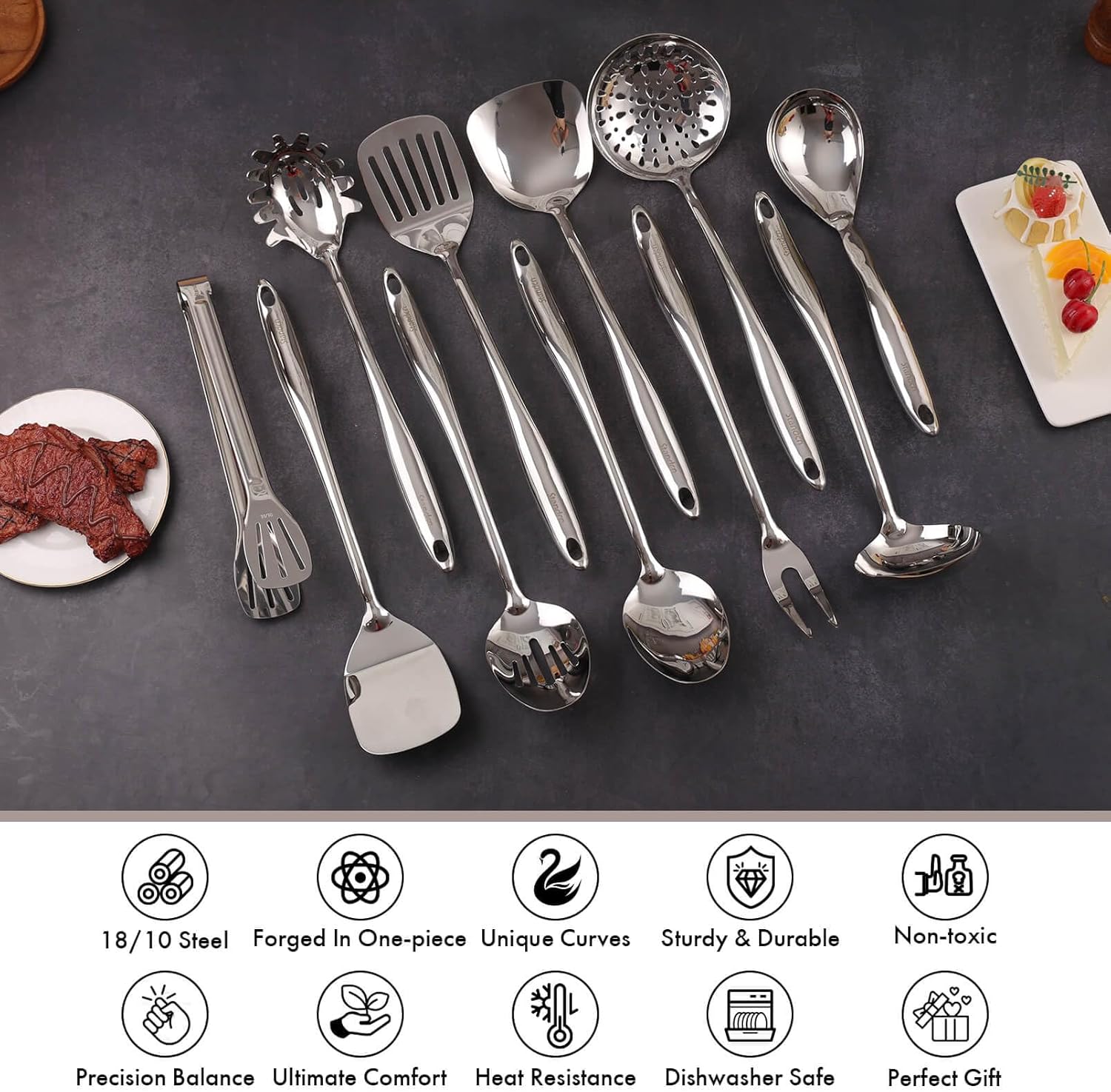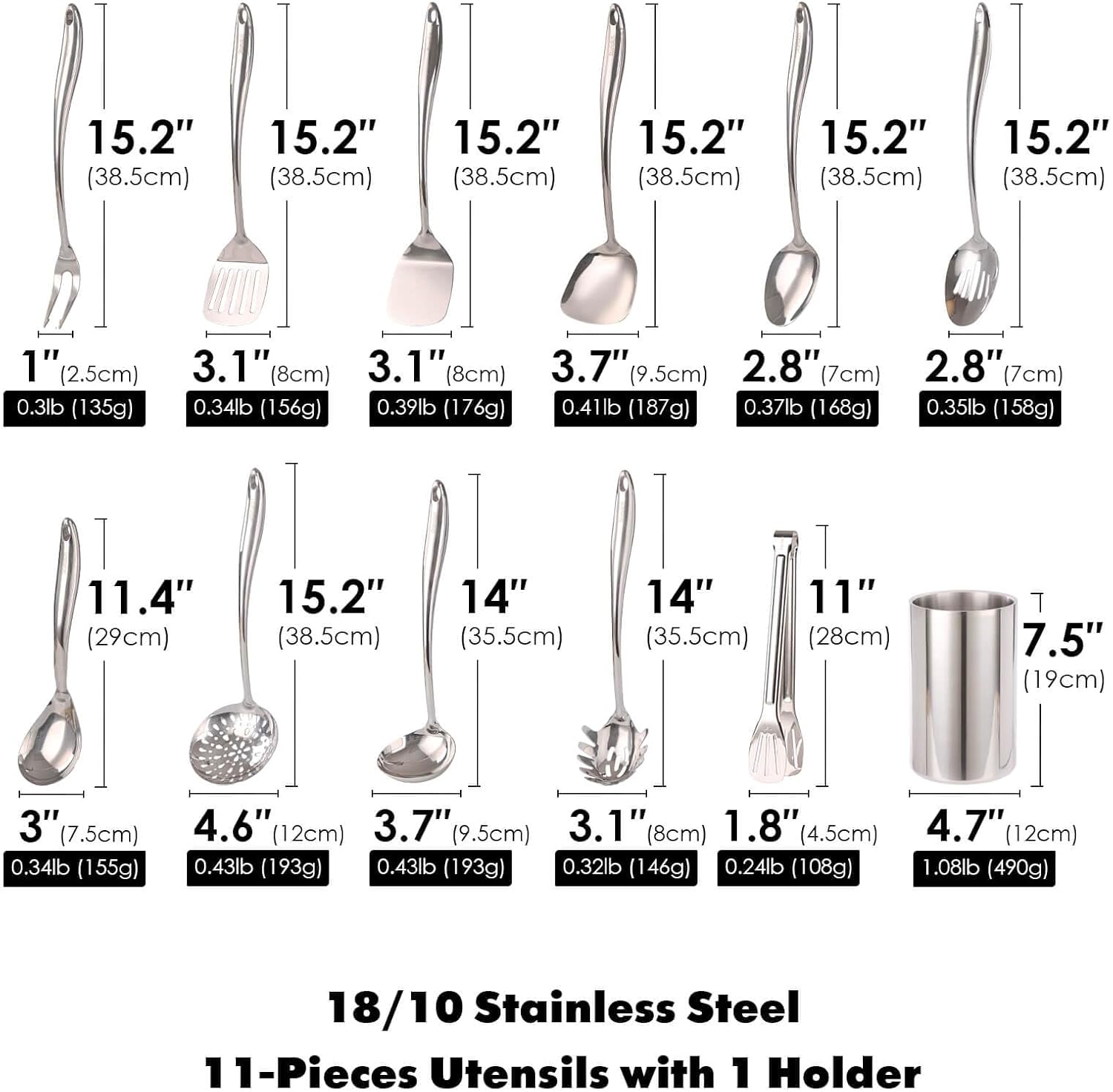 • 【Versatile 12-Pieces Utensils Set】: 1 utensil holder, 1 food tongs, 1 meat fork, 1 solid serving spoon, 1 slotted serving spoon, 1 spatula, 1 skimmer spoon, 1 slotted spatula turner, 1 solid spatula turner, 1 soup ladle, 1 spaghetti spoon, 1 large spoon. These premium utensils are safe to use for cooking any type of food and idea gift for friends and family who love cooking with premium quality kitchen utensils. Our utensils will exceed any expectations that your family, friends, or colleagues might have