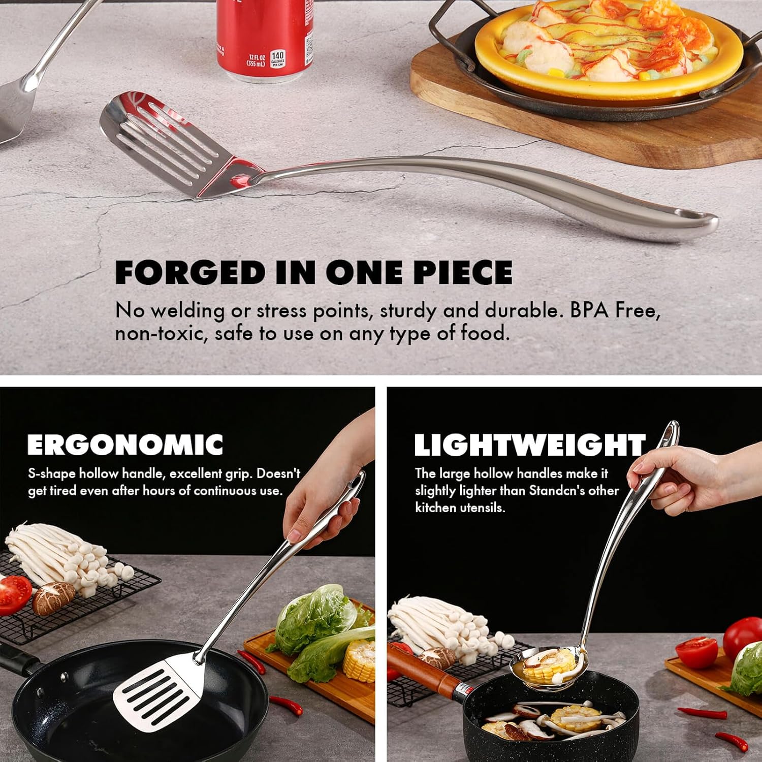 • 【15″ Long Cooking Utensils】: Ergonomic design, precise balance, excellent grip, long handle to provide high heat resistant, make sure the chef's hands stay cool and for long hours of pleasure while you prepping, cooking, grilling, and serving(The large hollow handles make it slightly lighter than Standcn's other utensils)